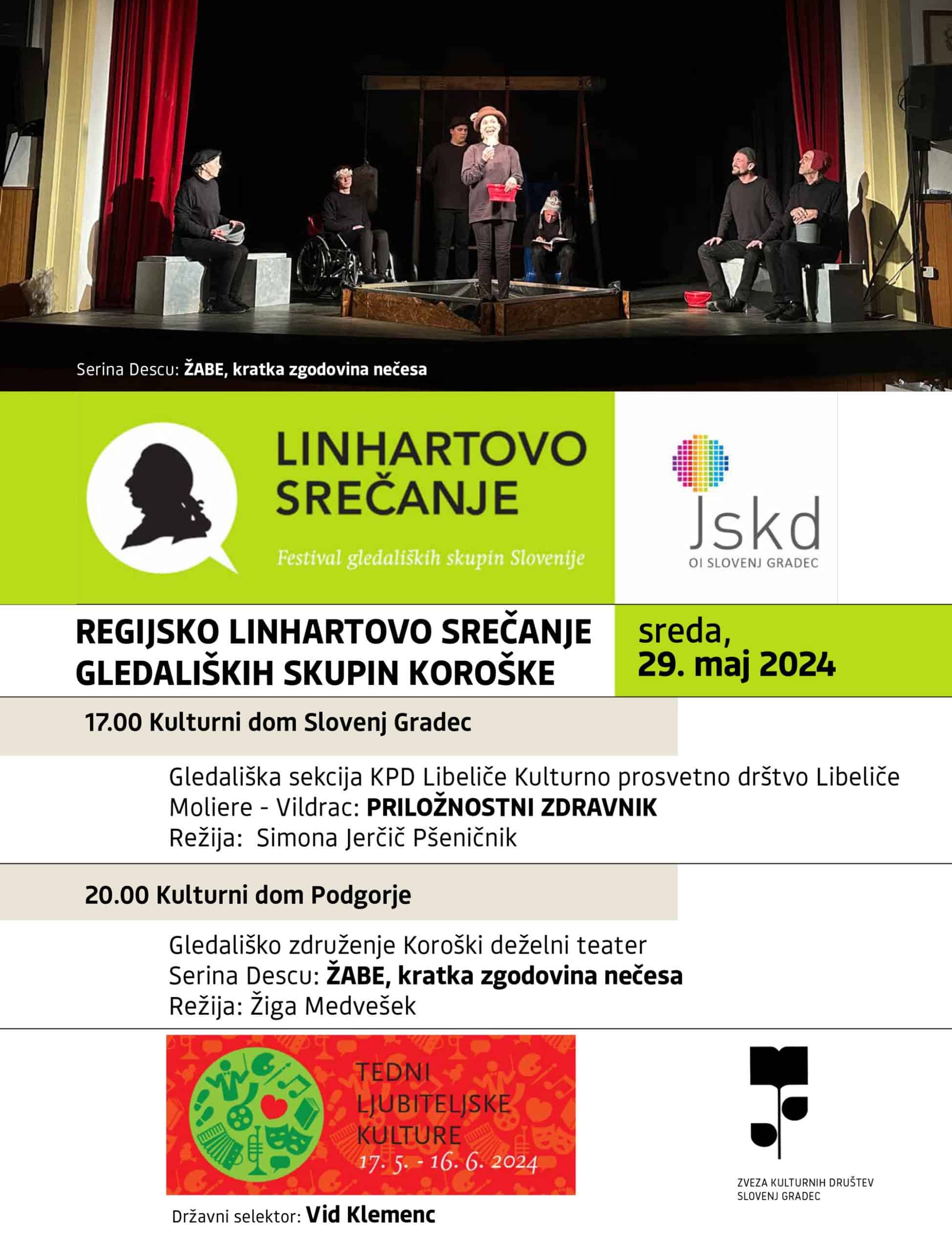 Javni sklad RS za kulturne dejavnosti Območna izpostava Slovenj Gradec organizira danes, 29. maja 2024, regijsko Linhartovo srečanje gledaliških skupin Koroške. Dogodek bo potekal v Kulturnem domu Slovenj Gradec in Kulturnem domu Podgorje.