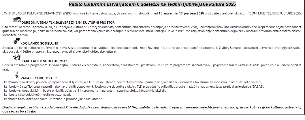 Veselijo se vaših predlogov in sodelovanja – skupaj boste ustvarili nepozaben kulturni utrip, ki bo letos zvenel še bolj brezmejno, v duhu osrednje teme TLK 2025: Brezmejni kulturni prostor.
