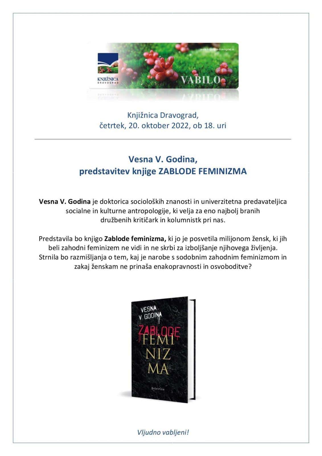 Tokrat bo v Dravogradu predstavila knjigo Zablode feminizma, ki jo je posvetila milijonom žensk, ki jih beli zahodni feminizem ne vidi in ne skrbi za izboljšanje njihovega življenja. Strnila bo razmišljanja o tem, kaj je narobe s sodobnim zahodnim feminizmom in zakaj ženskam ne prinaša enakopravnosti in osvoboditve?