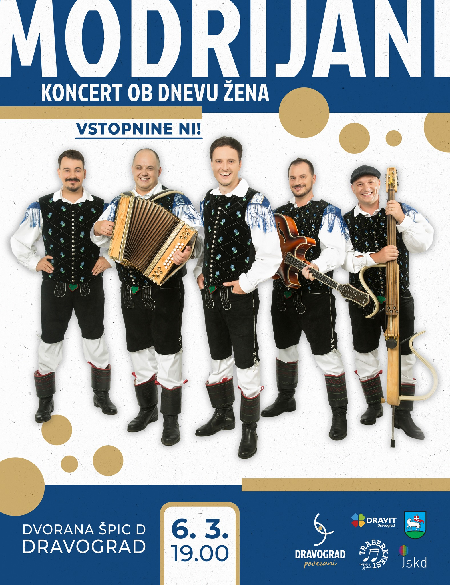 Drage dame, dekleta, žene in vse ljubiteljice lepih melodij, ob vašem prazniku vas čaka prav posebno glasbeno doživetje. V četrtek, 6. marca 2025, ob 19. uri v dvorani Špic D bodo za vas nastopili Modrijani, ena najuspešnejših in najbolj priljubljenih glasbenih skupin v Sloveniji.