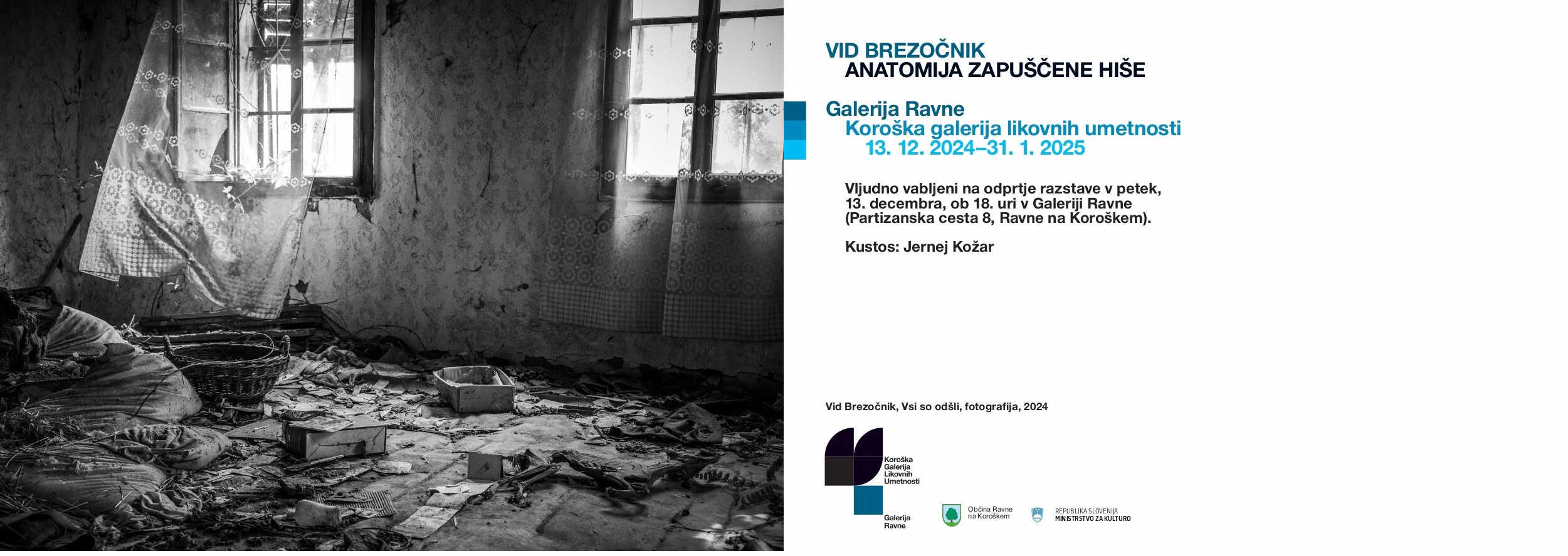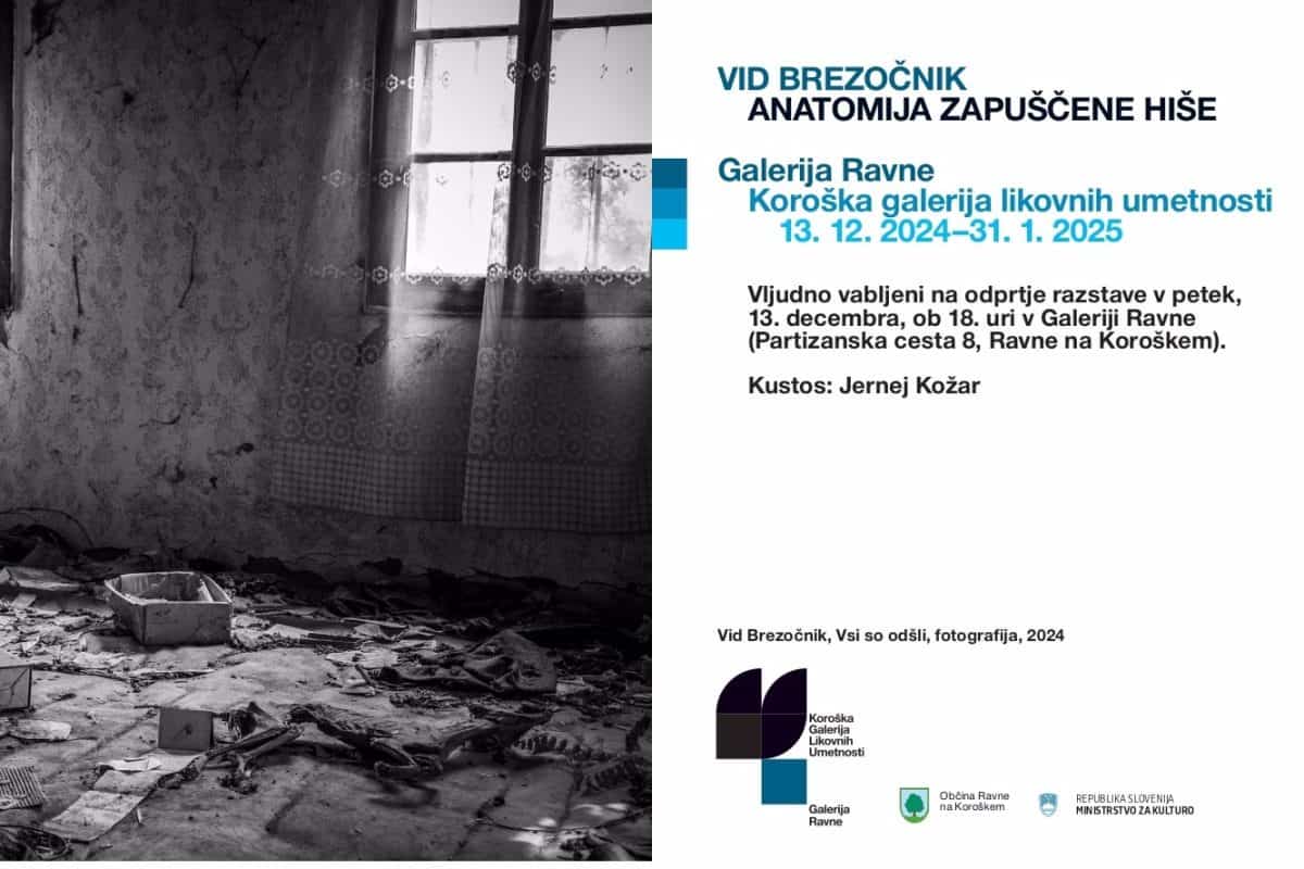 Na razstavi »Anatomija zapuščene hiše« Vid Brezočnik razstavlja serijo fotografij, nastalih leta 2024 v Križevcih v Prekmurju. Na njih opisuje zgodbo notranjosti zapuščene hiše. Razstava v Galeriji Ravne tako ponuja na ogled nekaj detajlov forenzičnih raziskav interierja in celo stenske podobe.