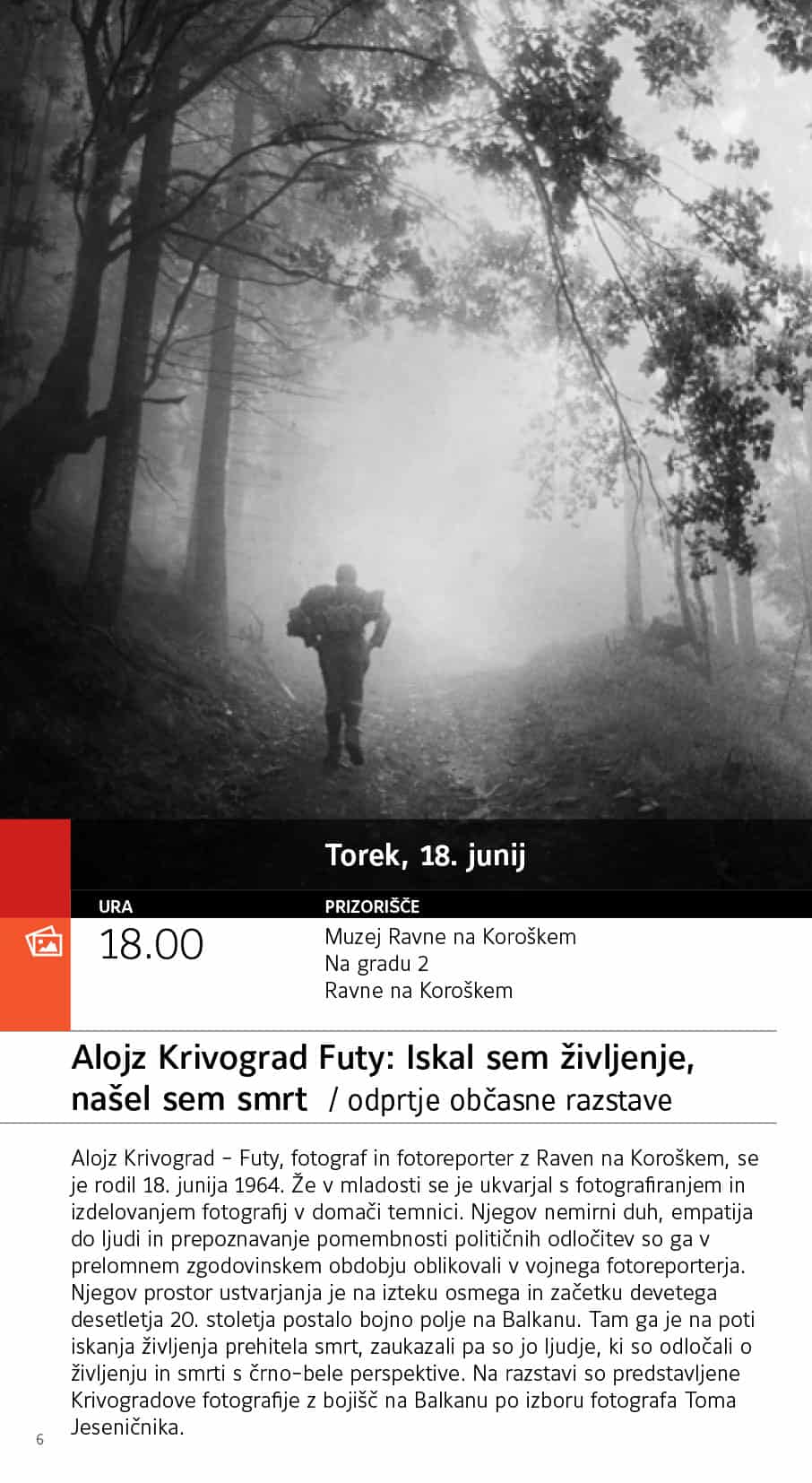 Alojz Krivograd – Futy, fotograf in fotoreporter z Raven na Koroškem, se je rodil 18. junija 1964. Že v mladosti se je ukvarjal s fotografiranjem in izdelovanjem fotografij v domači temnici. Njegov nemirni duh, empatija do ljudi in prepoznavanje pomembnosti političnih odločitev so ga v prelomnem zgodovinskem obdobju oblikovali v vojnega fotoreporterja. Njegov prostor ustvarjanja je na izteku osmega in začetku devetega desetletja 20. stoletja postalo bojno polje na Balkanu. Tam ga je na poti iskanja življenja prehitela smrt, zaukazali pa so jo ljudje, ki so odločali o življenju in smrti s črno-bele perspektive.