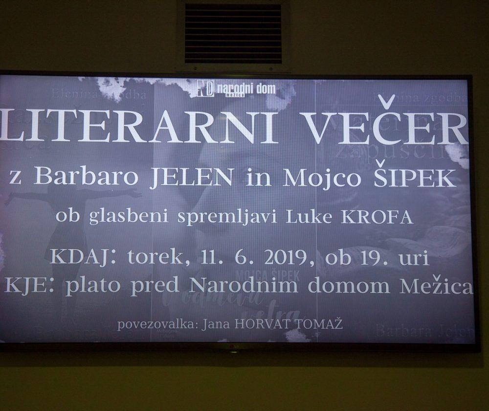 V torek, 11. 6. 2019, se je v okviru Mežiškega poletja pred Narodnim domom Mežica odvil Literarni večer z Barbaro in Mojco, ki ga je organiziral JKZ Narodni dom Mežica. Mladi pisateljici Barbara Jelen in Mojca Šipek sta predstavili svoja dela; Barbara dva romana iz serije Elenina zgodba, in sicer Materina zapuščina in Razsežnosti srca ter Mojca roman V odmevu vetra. Program je popestril z glasbeno spremljavo Luka Krof, literarni večer je povezovala Jana Horvat Tomaž.