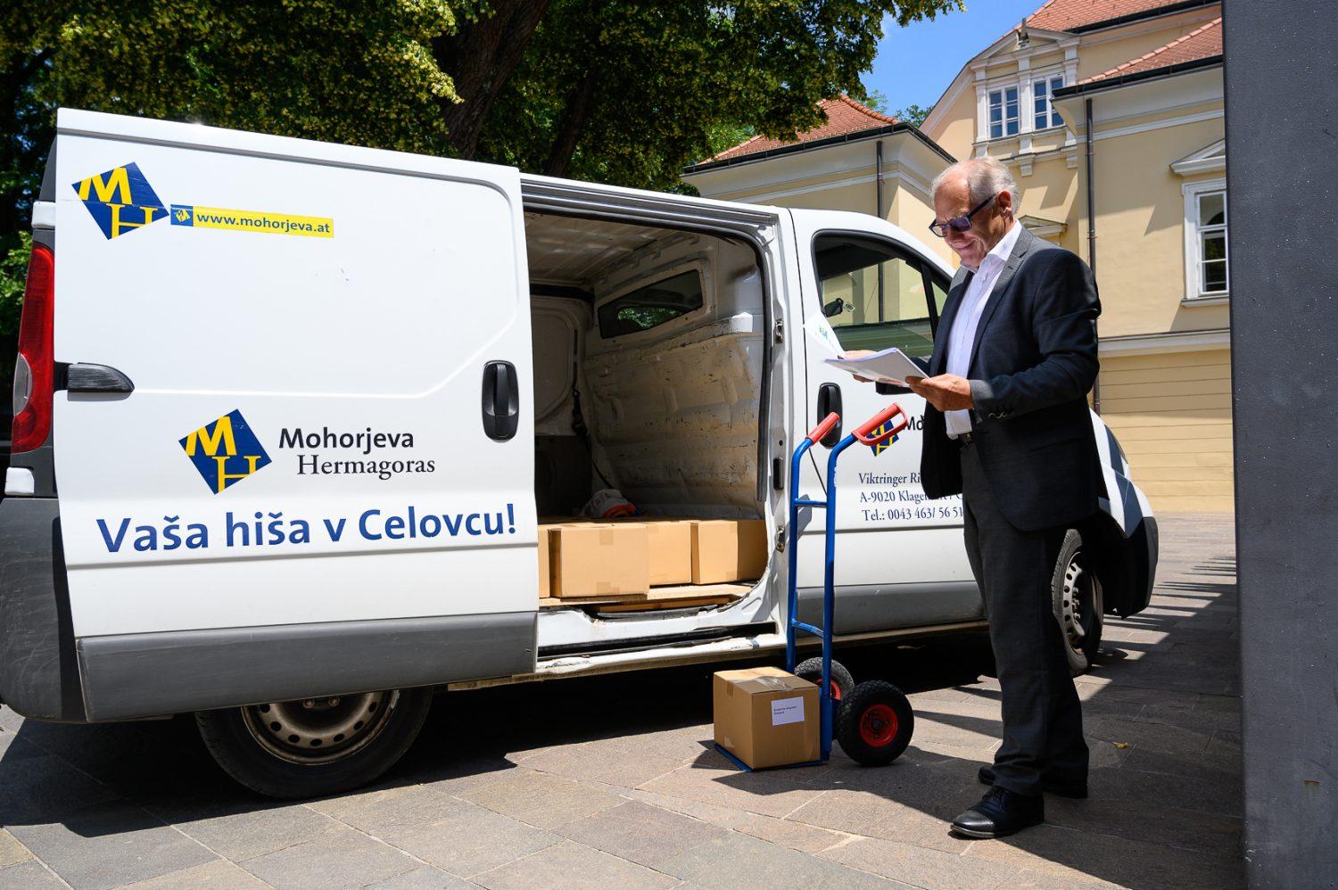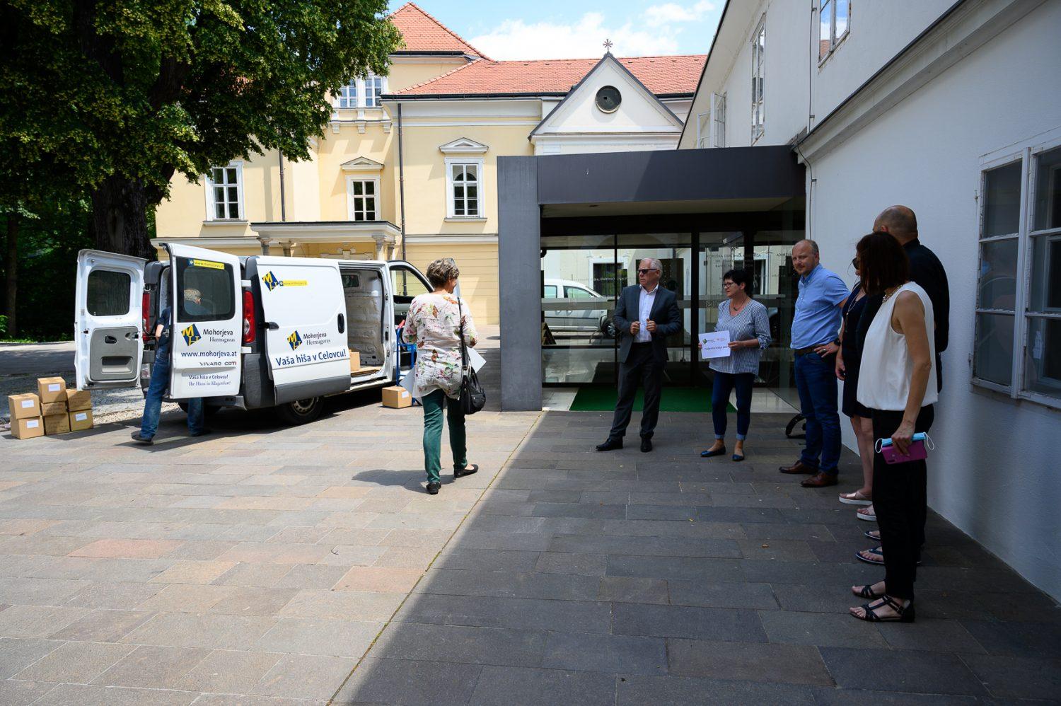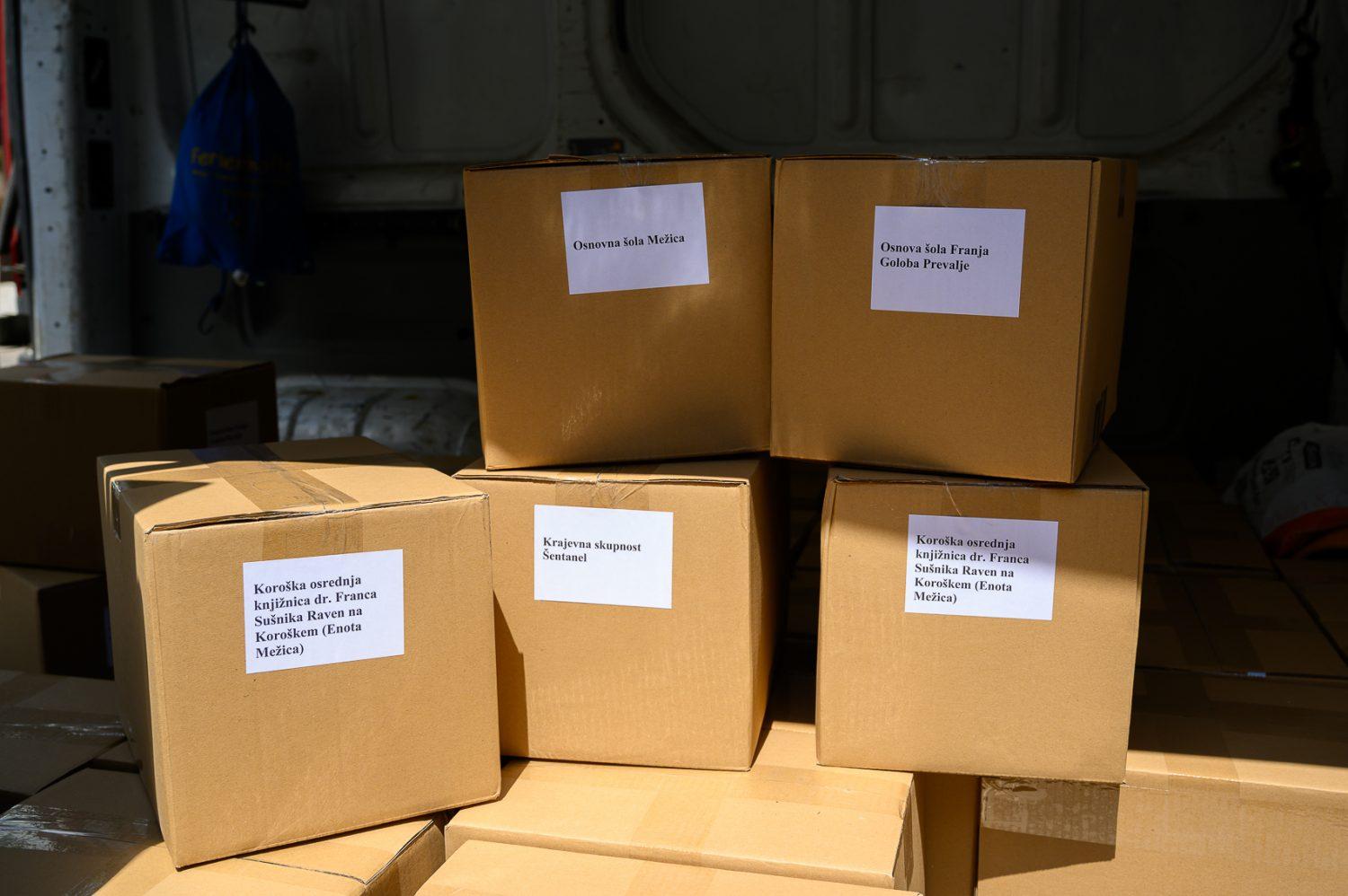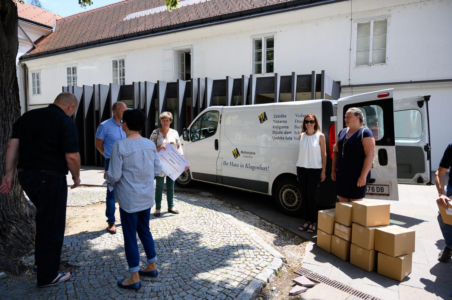 Predstavniki prejemnikov knjig iz Mežiške doline so prevzeli pakete knjig pred Koroško osrednjo knjižnico