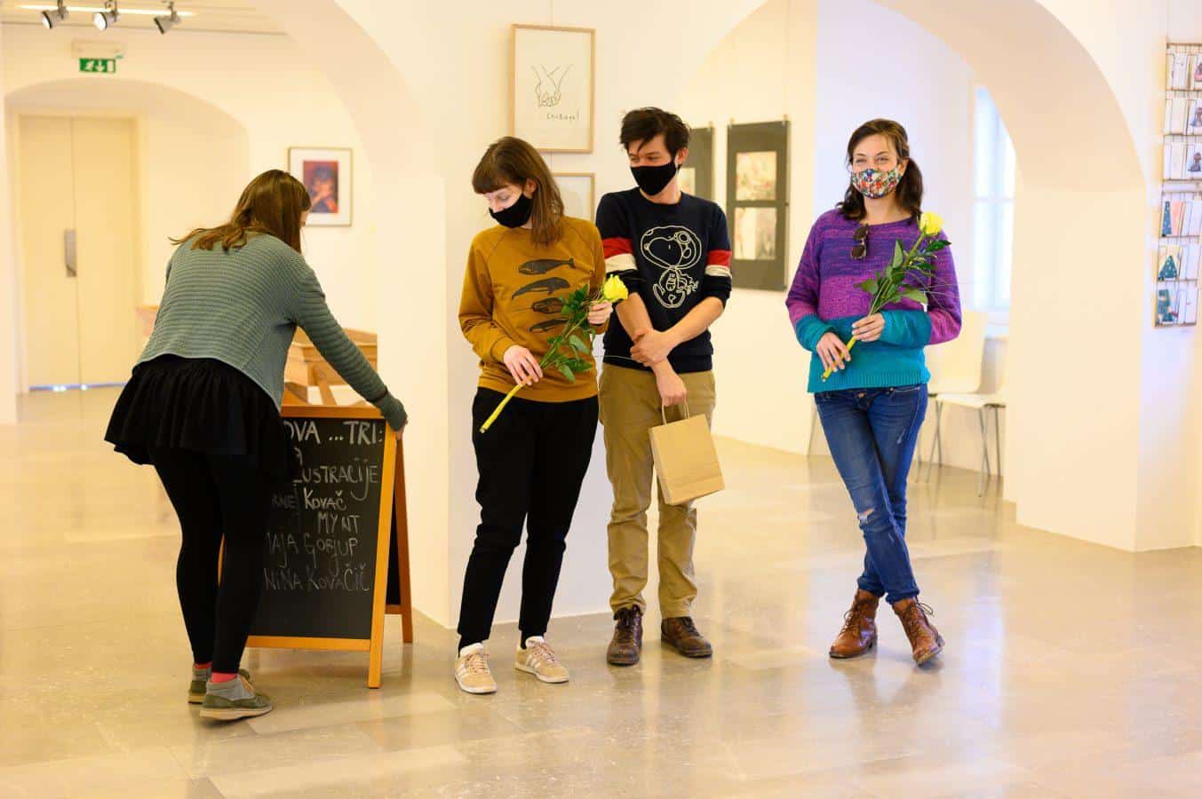 Vsakega avtorja je pospremilo spletno odprtje razstave in virtualen sprehod med razstavljenimi deli. Celotna razstava je bila izvedena v treh potezah, zato en, dva, tri ... V četrtek, 18. februarja 2021, pa so se vsi trije ilustratorji srečali in si skupno ogledali razstavljena dela. Nika Skudnik iz knjižnice je posnela tudi kratek, sproščen pogovor z njimi. Zdaj si je razstavo možno ogledati tudi v razstavišču knjižnice.