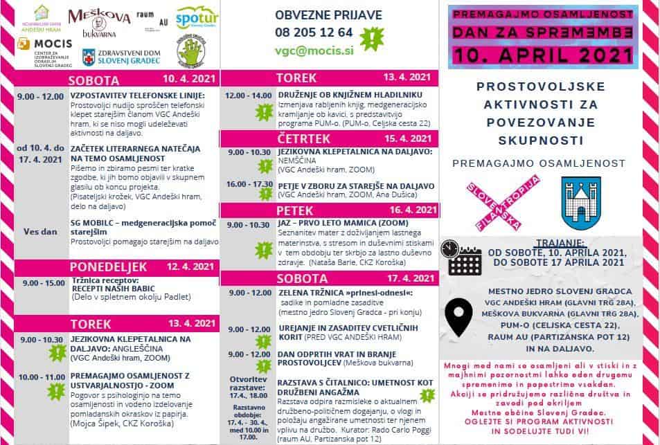 Letošnja akcija sicer poteka pod sloganom Premagajmo osamljenost, z njo pa želijo povezati ljudi po Sloveniji, s poudarkom na prostovoljski pomoči k premagovanju osamljenosti. Akcije bodo delno potekale na spletu, aktivnosti v živo pa bodo po Sloveniji izvajali do konca aprila. Glede na napovedi, bo za pestro dogajanje poskrbljeno tudi v Slovenj Gradcu.