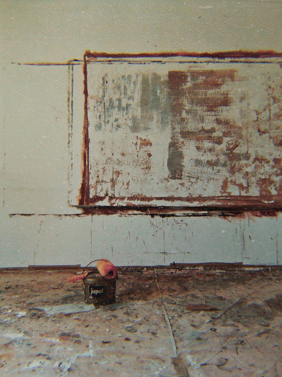 Površine slik so sestavljene iz knjig - "najprej sem vsako stran posebej izbrisala z barvo, jih nato iztrgala iz knjige ter jih polepila po platnu. Nagubane dele sem potem potrgala s slike in jih brusila z brusnim papirjem, da sem dobila naključne vzorce iz nastalih praznih. Tako nobeden izmed pravokotnikov, ki gradijo sliko, ni enak drugemu, a ker si mrežna strukturiranost podredi razlike med njimi, se zdi, kot da gre za urejen sistem. Želela sem, da je na sliki vidna grobost dejanja v svoji snovnosti. Navsezadnje angleška beseda za izbris erasure izvira iz latinske besede erasus, pretekli deležnik eradere, kar pomeni postrgati, spraskati, drgniti – to implicira izbris kot akcijo in izbrisan tekst kot rezultat te akcije.", pove avtorica.