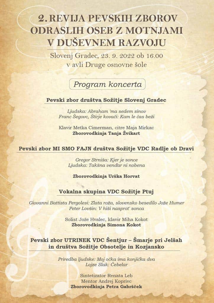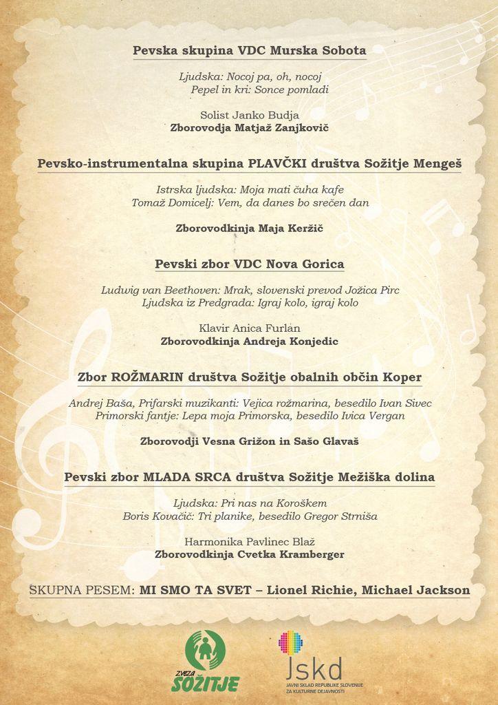 Nastopili bodo zbori iz vse Slovenije: Pevski zbor društva Sožitje Slovenj Gradec, Pevski zbor Mi smo fajn iz Radelj ob Dravi, Vokalna skupina VDC Sožitje Ptuj, Pevski zbor Utrinek VDC Šentjur - Šmarje pri Jelšah in društva Sožitje Obsotelje in Kozjansko, Pevska skupina VDC Murska Sobota, Pevsko-instrumentalna skupina Plavčki iz Mengeša, Pevski zbor VDC Nova Gorica, Zbor Rožmarin iz Kopra in Pevski zbor Mlada srca društva sožitje Mežiška dolina.