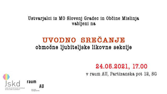 V želji, da bi novica o ustanovitvi območne ljubiteljske likovne sekcije dosegla čim širši krog deležnikov, vas, dragi bralci, organizatorji prosijo za pomoč pri razširjanju informacij o uvodnemu sestanku, ki bo potekal 24. maja, ob 17.00 uri, v prostorih raum AU, Partizanska pot 12, Slovenj Gradec.
