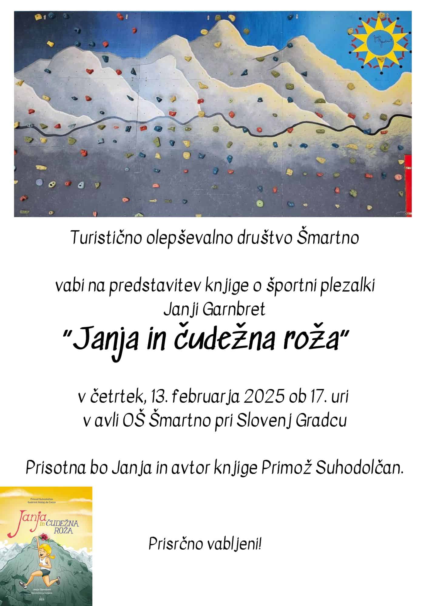 Turistično olepševalno društvo Šmartno vabi na zanimivo predstavitev knjige Primoža Suhodolčana Janja in čudežna roža.