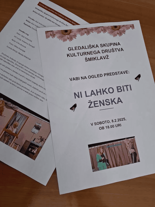 Kulturno društvo Šmiklavž in Gledališka skupina KD Šmiklavž vas vabita na smeha polno gledališko predstavo "Ni lahko biti ženska", ki bo v soboto ob 18.00 v dvorani OŠ Šmiklavž.