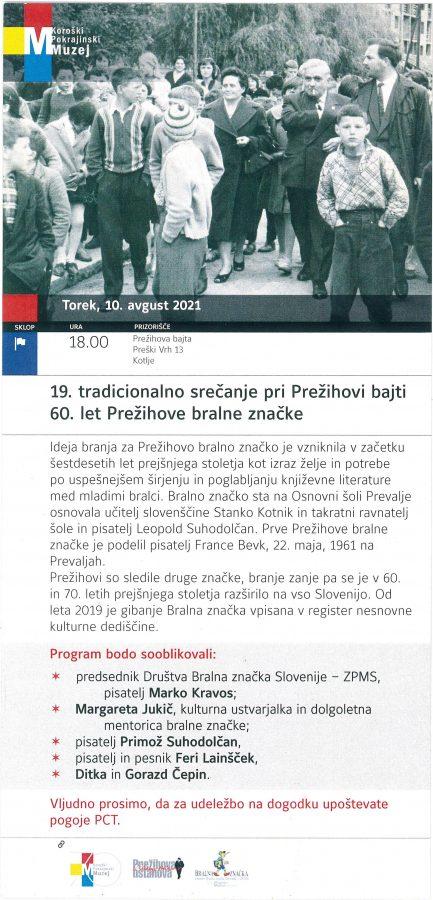Vabljeni na 19. tradicionalno srečanje pri Prežihovi bajti, ki bo letos v znamenju 60-letnice Prežihove bralne značke v torek, 10. avgusta 2021, ob 18. uri na Prežihovi bajti, Preški Vrh 13, Kotlje.