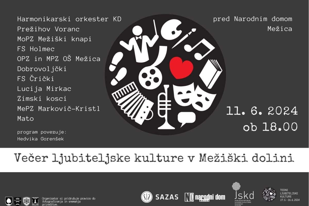 V torek, 11. junija 2024, ob 18. uri vas vabijo pred Narodni dom Mežica na Večer ljubiteljske kulture v Mežiški dolini, kjer se bodo predstavila društva, skupine ter posamezniki iz različnih področij ljubiteljske kulture.