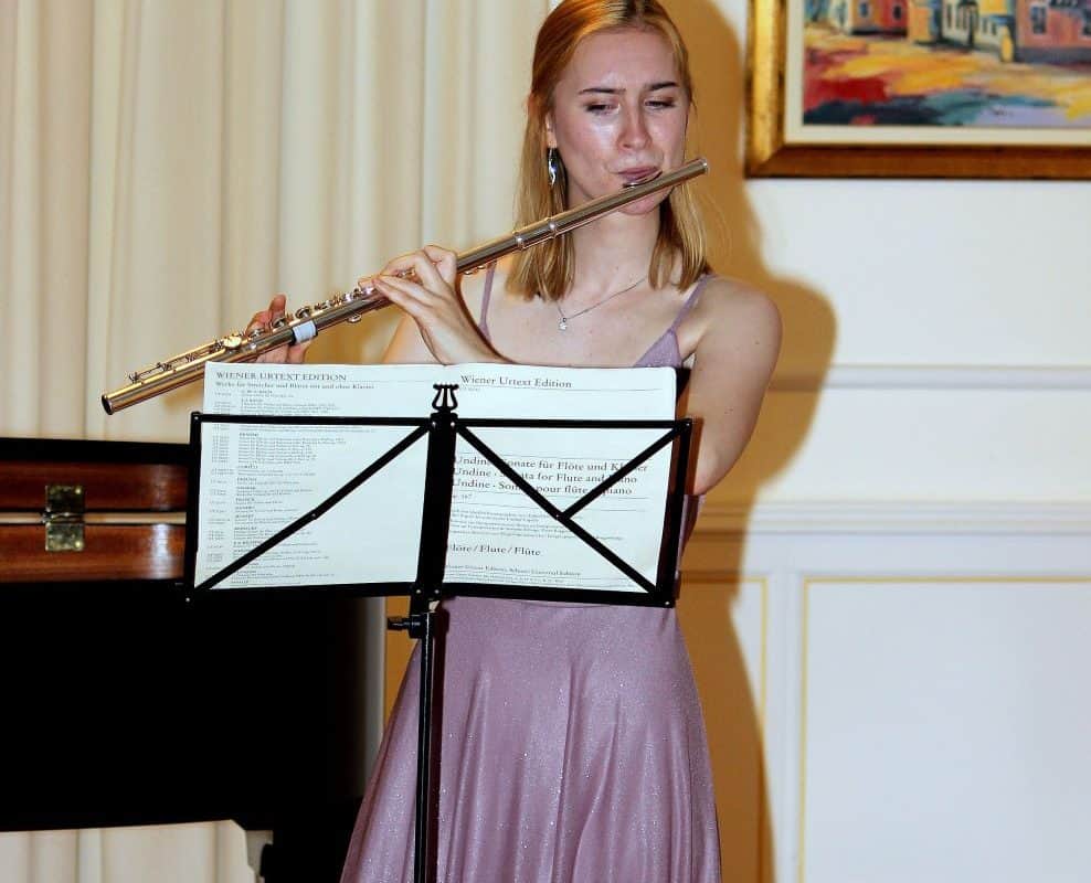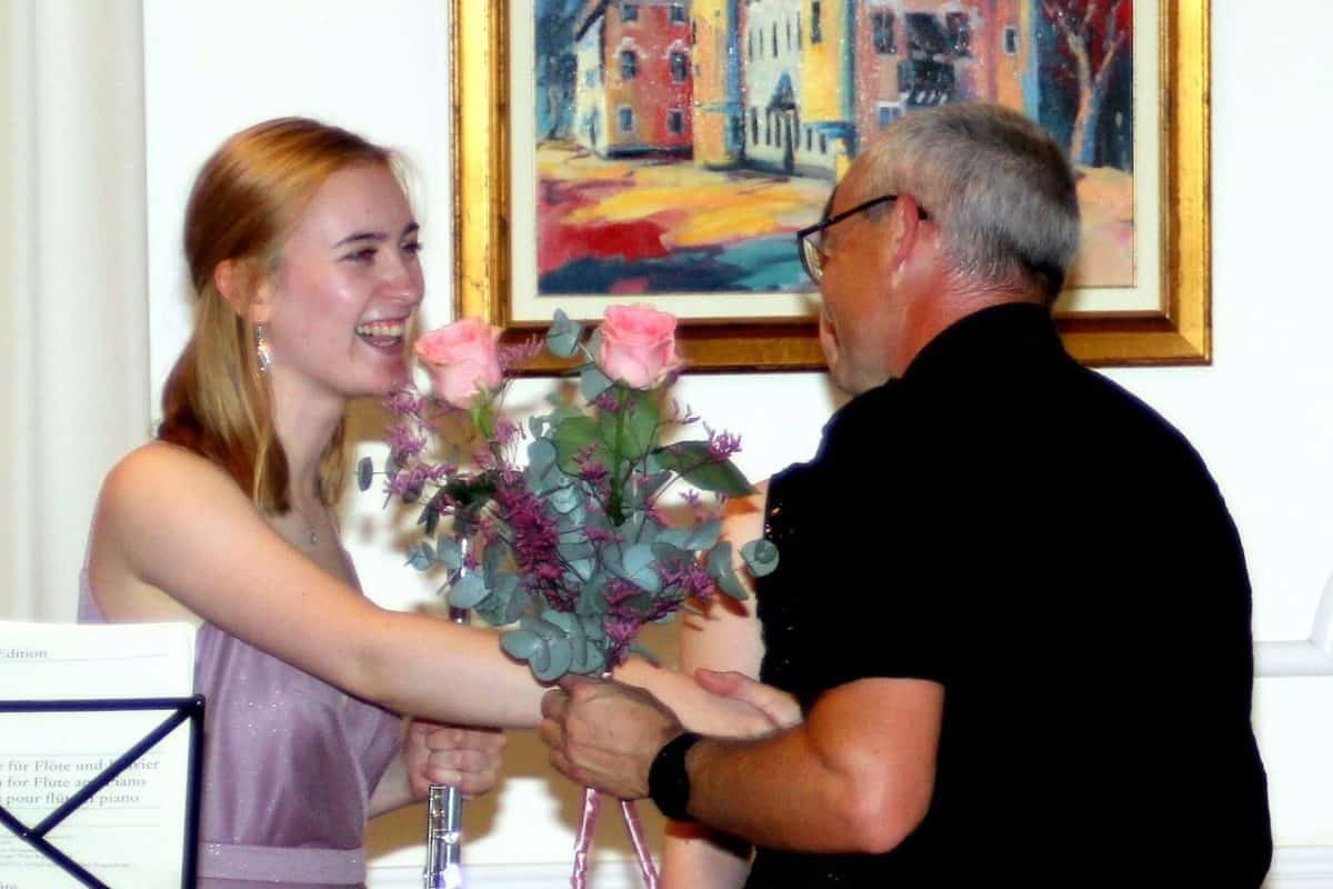 Glasbenici sta izvrstno odigrali koncert in navdušili nabito polno dvorano. Na repertoarju so bile skladbe kot so E. Bozza: Image za solo flavto, C. Reinecke: Sonata za flavto in klavir, P. Sancan: Sonatina za flavto in klavir, in skladba koroškega skladatelja Lojzeta Lebiča, ki letos praznuje visok osebni jubilej, saj bo avgusta dopolnil 90 let: Aprilske vinjete za solo flavto.