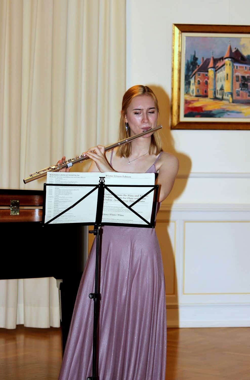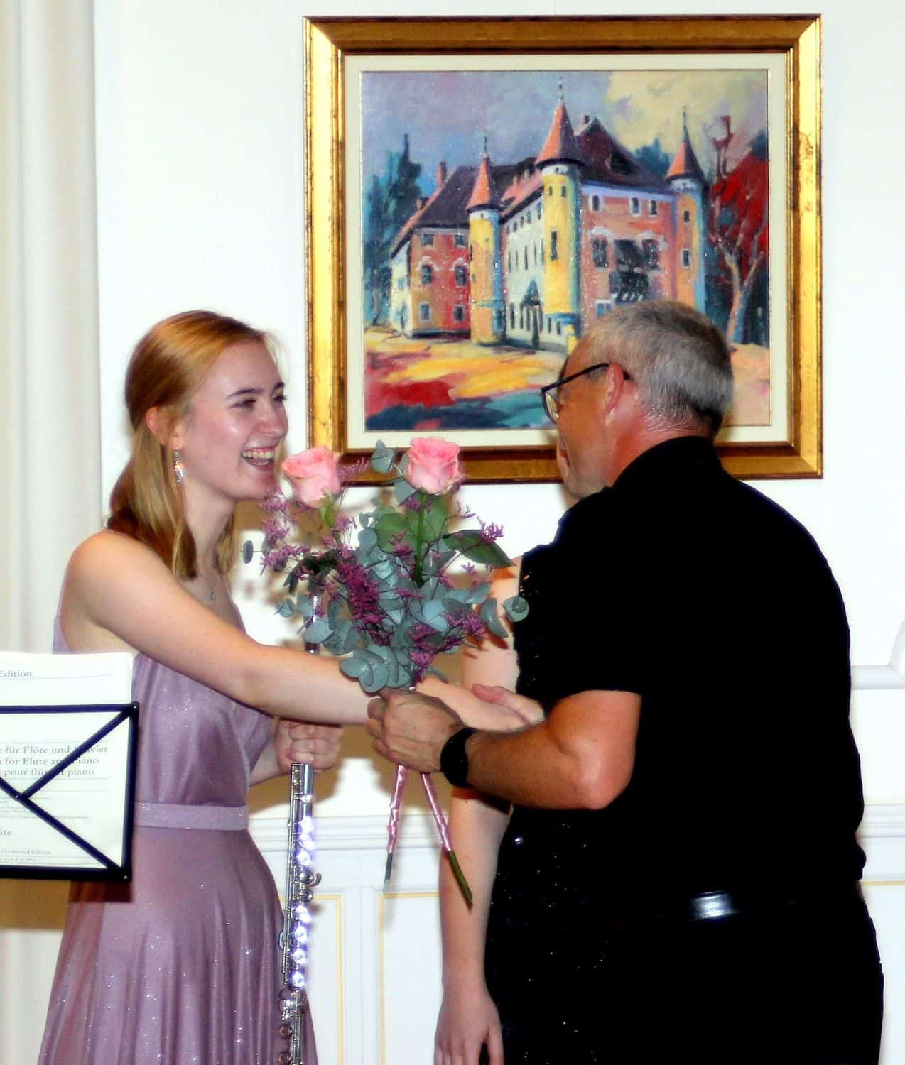 Glasbenici sta izvrstno odigrali koncert in navdušili nabito polno dvorano. Na repertoarju so bile skladbe kot so E. Bozza: Image za solo flavto, C. Reinecke: Sonata za flavto in klavir, P. Sancan: Sonatina za flavto in klavir, in skladba koroškega skladatelja Lojzeta Lebiča, ki letos praznuje visok osebni jubilej, saj bo avgusta dopolnil 90 let: Aprilske vinjete za solo flavto.