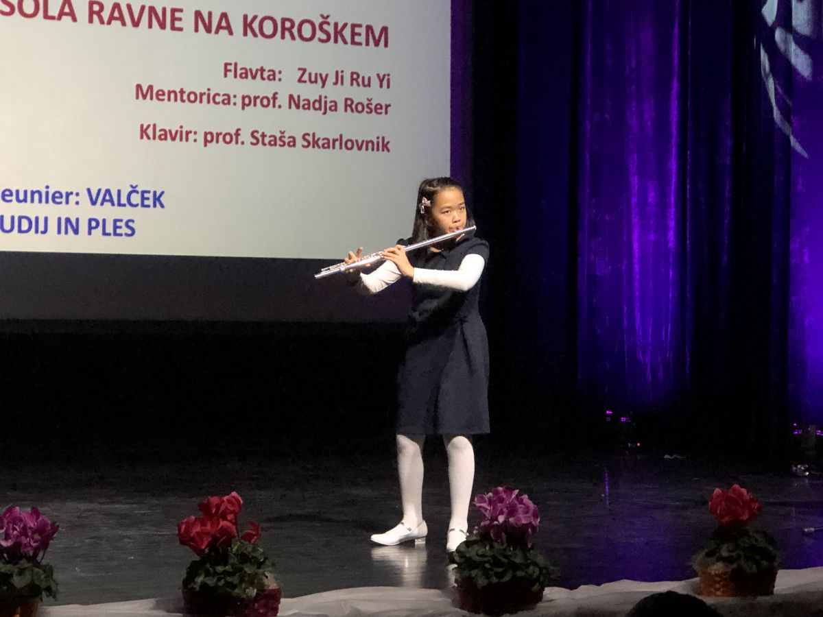 Za Glasbeno Šolo Ravne na Koroškem je pod mentorstvom Nadje Rošer in ob spremljavi Staše Skarlovnik s flavto nastopila Zuy Ji Ru Yi, zaigrala je skladbi Valček ter Preludij in ples.