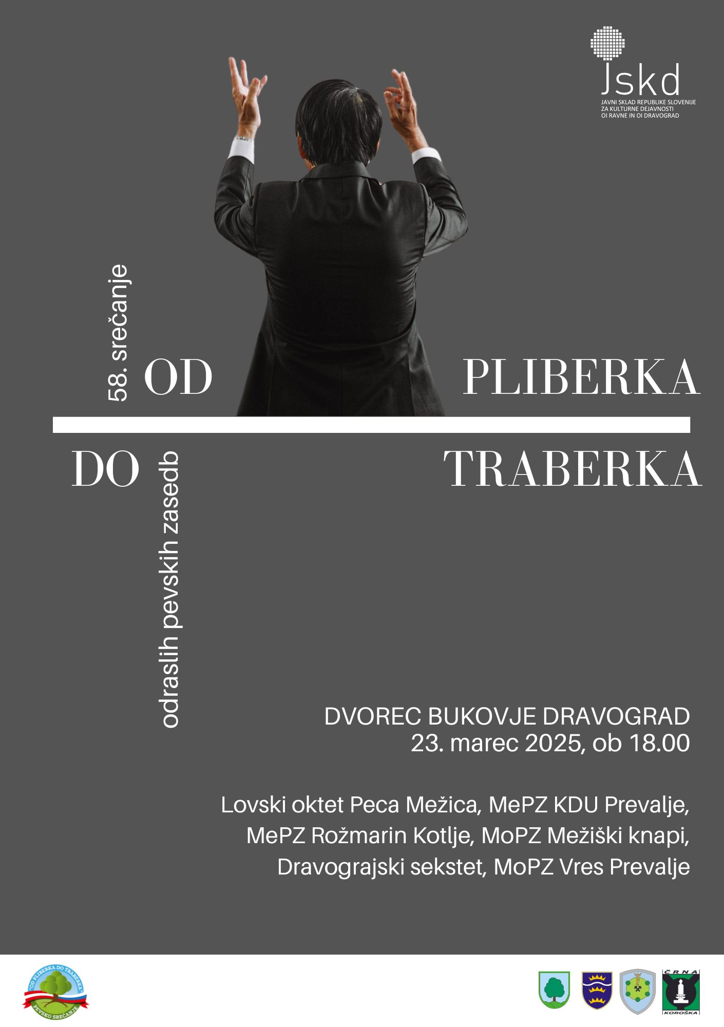 V Dvorcu Bukovje Dravograd, 23. marec 2025, ob 18.00 bodo nastopili: Lovski oktet Peca Mežica, MePZ KDU Prevalje, MePZ Rožmarin Kotlje, MoPZ Mežiški, knapi, Dravograjski sekstet, MoPZ Vres Prevalje.