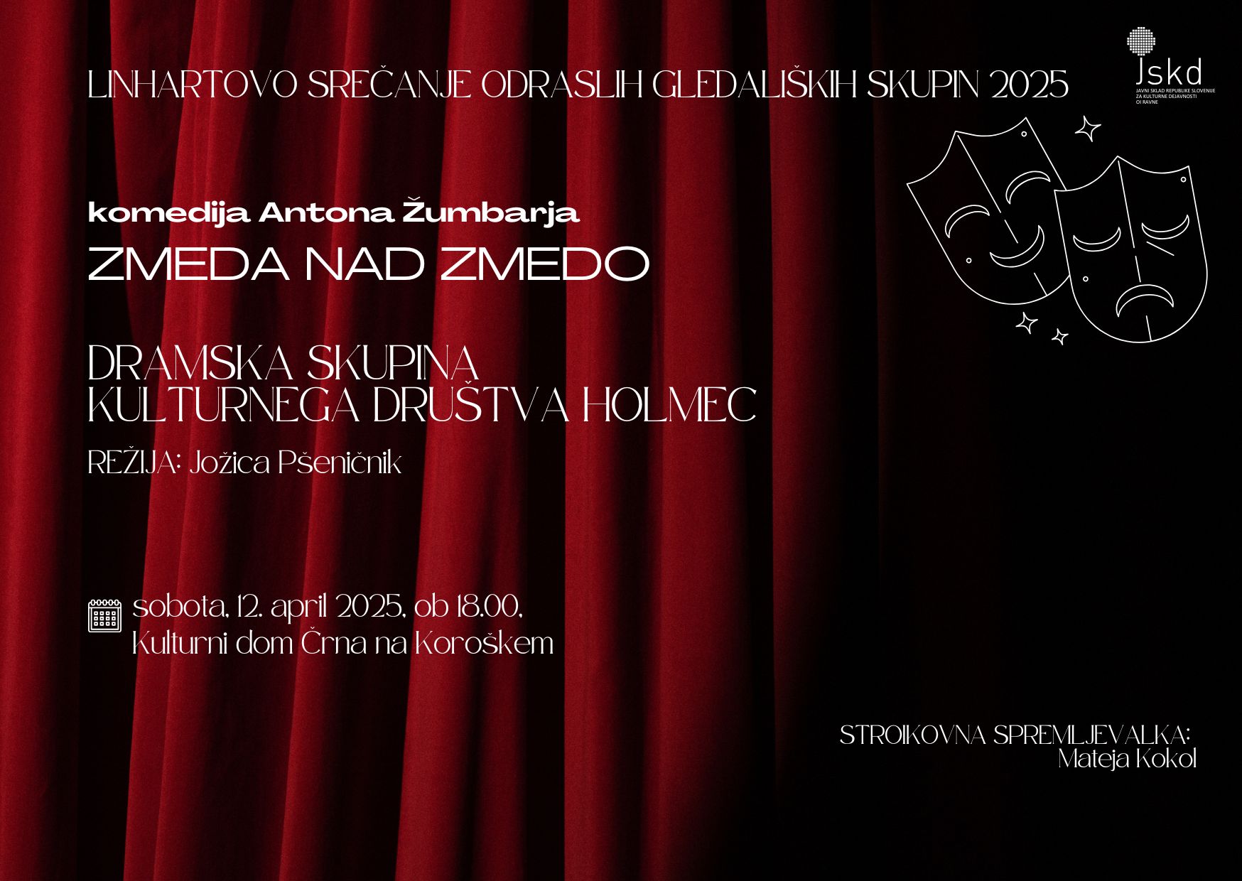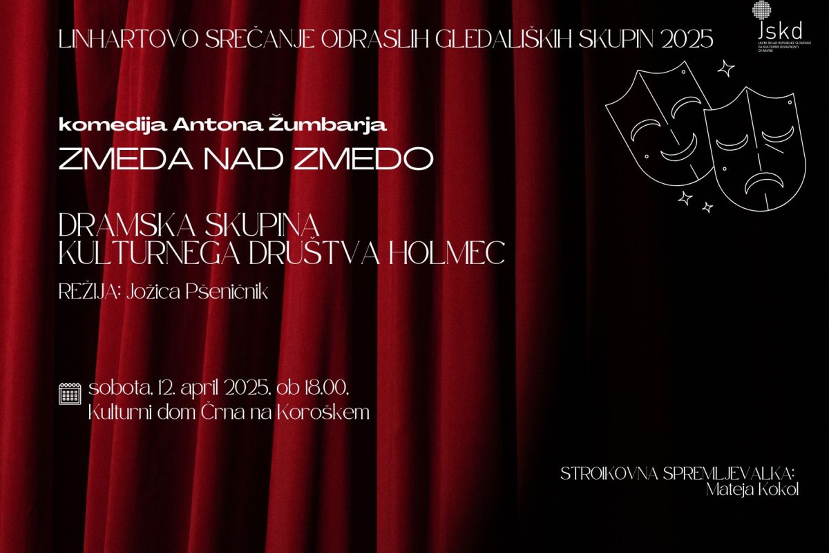 Dramska skupina KD Holmec se bo s predstavo ''Zmeda nad zmedo'' v sklopu Linhartovega srečanja odraslih gledaliških skupin predstavila v soboto, 12. aprila 2025, ob 18. uri v Kulturnem domu Črna na Koroškem.