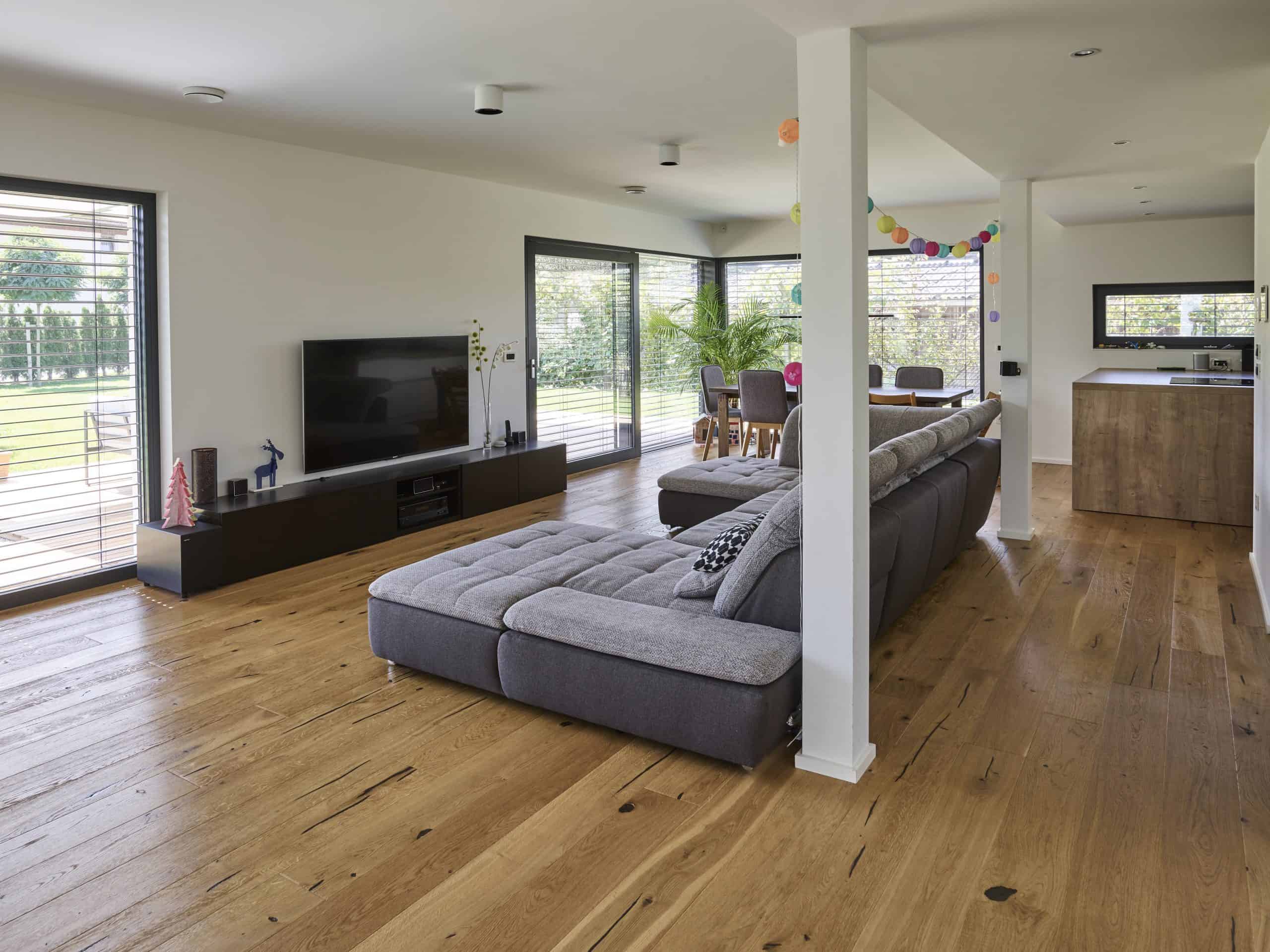 Odprti bivalni prostori so umeščeni v pritličje, v njih pa se prepletajo dnevna soba, jedilnica in kuhinja, ki omogočajo družini, da v s soncu obsijanem prostoru skupaj preživljajo proste trenutke. Bivalni prostori so z velikimi panoramskimi zasteklitvami povezani s prostorno teraso in velikim vrtom.