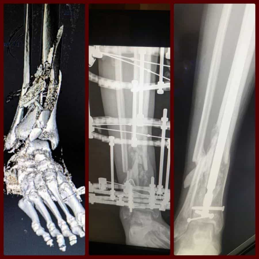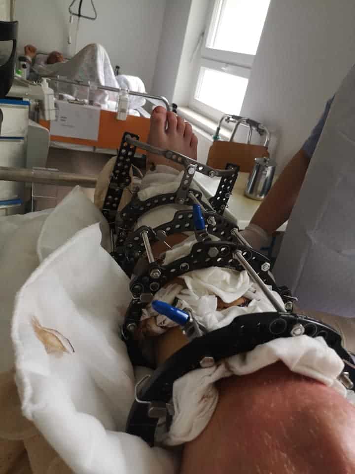 Po padcu sem videl, da mi je iz škornja začela teči kri, kar je pomenilo, da imam odprti zlom, kar so kasneje potrdili tudi zdravniki. Takoj je sledila operacija. Zvečer sem se zbudil v postelji z bolečo nogo in zunanjim fiksaterjem. Naslednji dan je bil ponedeljek, ko so mi na viziti povedali, da imam večkratni komplicirani zlom desnega gležnja, goleni in mečnice. Če se zaplete, je tudi možnost, da ostanem brez noge. Čez 3 dni so me na mojo željo in po posvetom z zdravniki premestili na Travmatologijo v UKC Ljubljana.