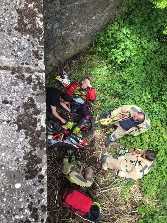 Seveda, tega nikoli ne bom pozabil. Peljal sem se ob železniški progi med Ravnami in Prevaljami, kjer sem zaradi razmočene podlage in prevelike hitrosti padel v jašek oz. podhod pod železniško progo, katerega sem že 1000x obvozil. Ko sem videl, da gre motor naravnost proti luknji in da se kljub stisnjenim zavoram ne ustavlja, sem se iz njega odrinil in letel cca. 6m po zraku in nato treščil v zid. Nagonsko sem predse iztegnil desno nogo, ki je tudi pobrala vso silo in me rešila drugih poškodb. Padel sem 3m globoko na motor in videl nogo, da je obrnjena v napačno stran. Najprej sem poklical prijatelje, ki so prvi prišli do mene, oni pa so nato poklicali reševalce, ki so me skupaj z gasilci odnesli do reševalnega vozila in nato prepeljali v SB SG, za kar se vsem lepo zahvaljujem!