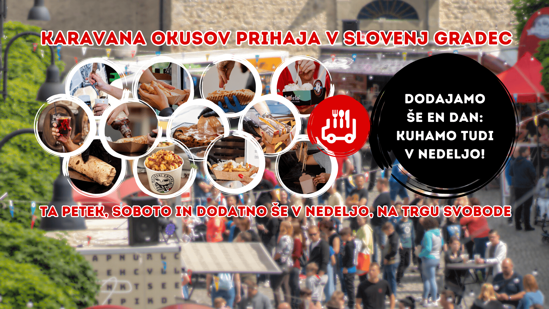 Prvi slovenski food truck festival se na vašo željo vrača na idilični Trg svobode v Slovenj Gradcu. S pisanimi tovornjački in prikolicami polnimi dobrot se bodo ustavili na trgu, zategnili ročno zavoro, prižgali peči, odprli lopute in pred vašimi očmi pripravili vrhunski street food festival.