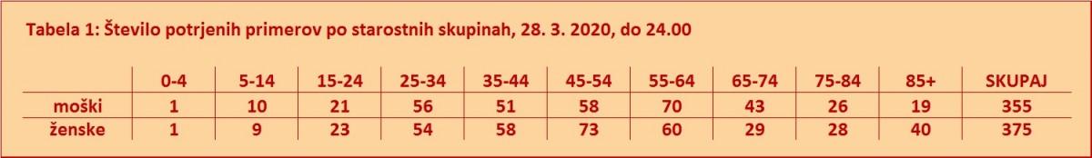 Do 28.3.2020 do 24. ure je bilo po podatkih NIJZ opravljenih 20.753 testiranj, od tega je bilo 737 pozitivnih testov.