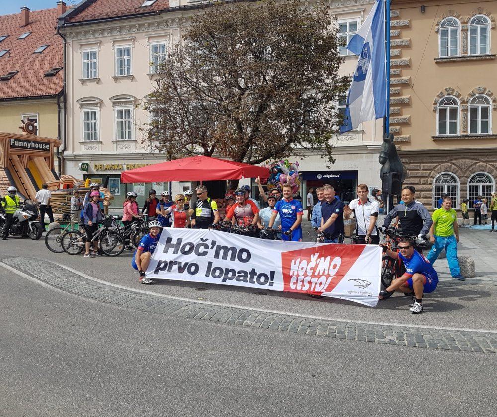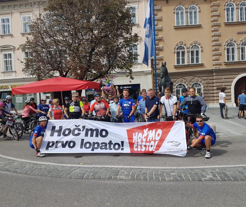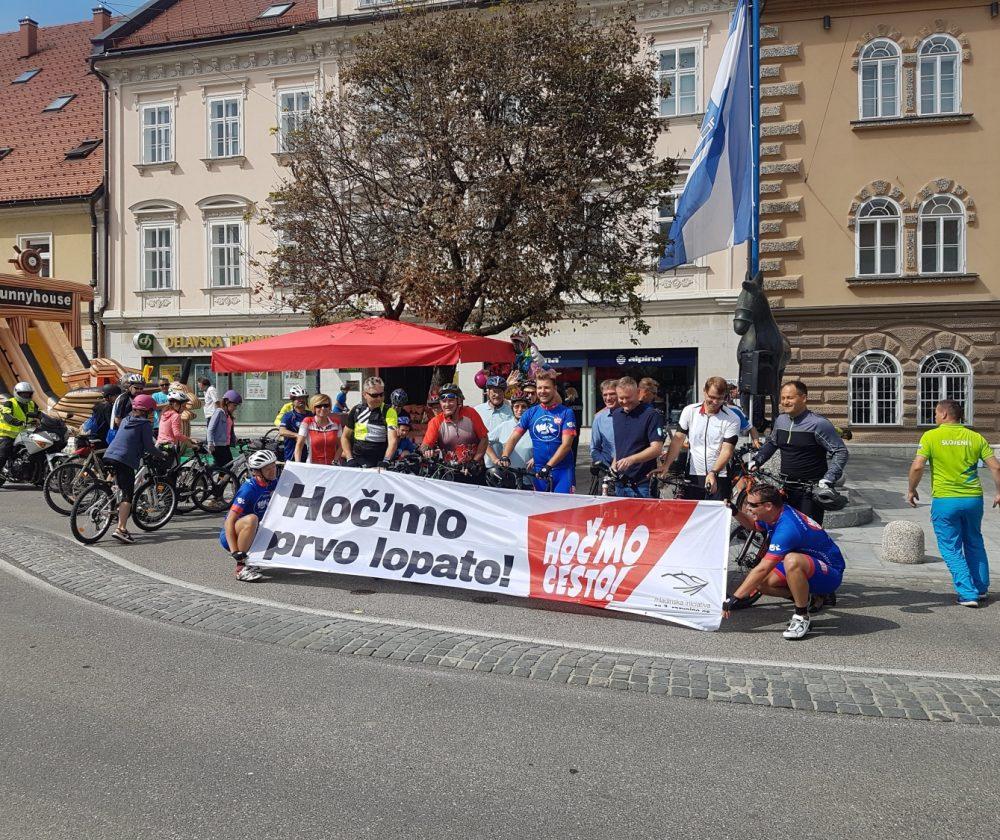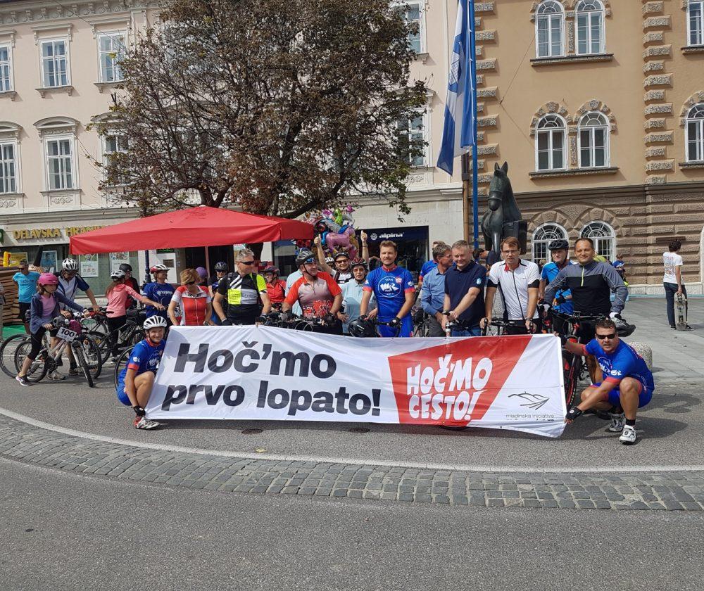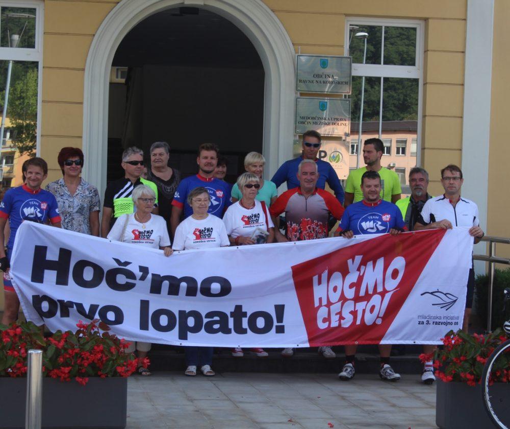 »Hoč`mo prvo lopato!« se je glasil slogan 5. kolesarjenja po trasi bodoče hitre ceste na Koroško, ki ga je danes, 14. septembra, na relaciji Šentrupert - Velenje - Graško Goro - Slovenj Gradec - Dravograd - Ravne na Koroškem, organizirala Mladinska iniciativa za 3. razvojno os. Kolesarjenja se je skupno udeležilo približno 100 udeležencev, skupina petih kolesarjev pa je prekolesarila celotno traso, torej so danes pregonili približno 70 kilometrov.