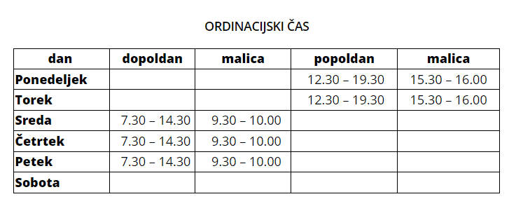 Pacienti se lahko naročijo telefonsko, osebno ali po e-pošti vsak delovni dan osebno v ordinaciji ali po e-pošti ambulanta.mislinja@zd-sg.si .
