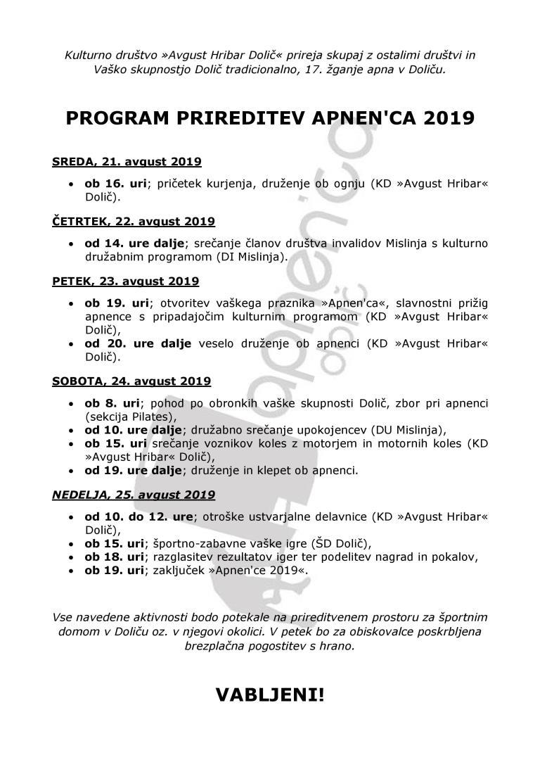 Na Facebook strani Kultura Dolič so v vabilu zapisali: »Z veseljem sporočamo, da letošnja tradicionalna prireditev Apnen'ca bo. Po enoletnem premoru smo zopet združili moči z Vaško skupnostjo Dolič in tako bomo ob tradicionalni že 17. Apnen'ci praznovali tudi praznik Vaške skupnosti Dolič. V sodelovanju z društvi v kraju smo pripravili pester program, zato smo prepričani, da se bo za vsakogar našlo nekaj zanimivega. V veliko čast in veselje nam bo, če boste podprli naš trud in delo in se tako udeležili kakšne prireditve. V petek ob otvoritvi bo na voljo tudi brezplačna pogostitev za vse obiskovalce, kasneje pa sledi veselo druženje ob ognju. Povabite tudi svoje znance, prijatelje in skupaj pripravimo lep zaključek letošnjega poletja.«