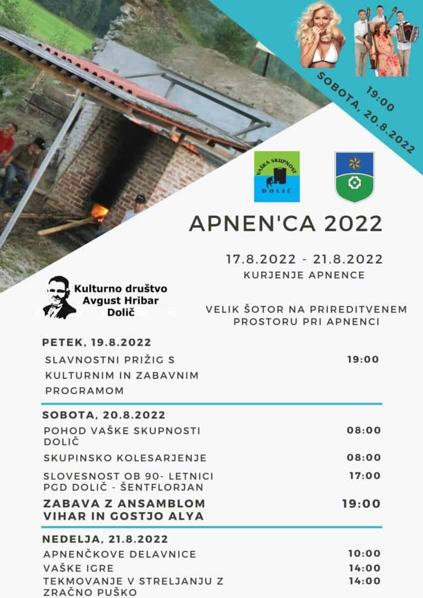 - 19:00 -> Uradna otvoritev Apnence s kulturnim programom. Brezplačna pogostitev za vse obiskovalce (KD AH DOLIČ)