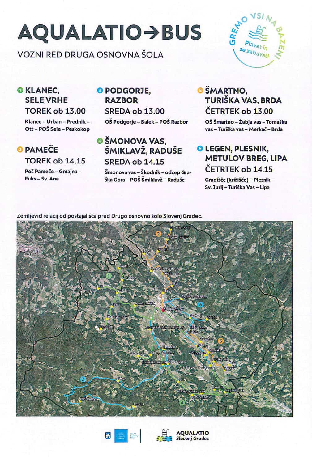 Tudi letos bo, od 2. julija do 28. avgusta 2024, ponovno vozil Aqualatio bus. Bus bo vozil na različnih lokacijah ob torkih, sredah in četrtkih po naslednjem voznem redu: