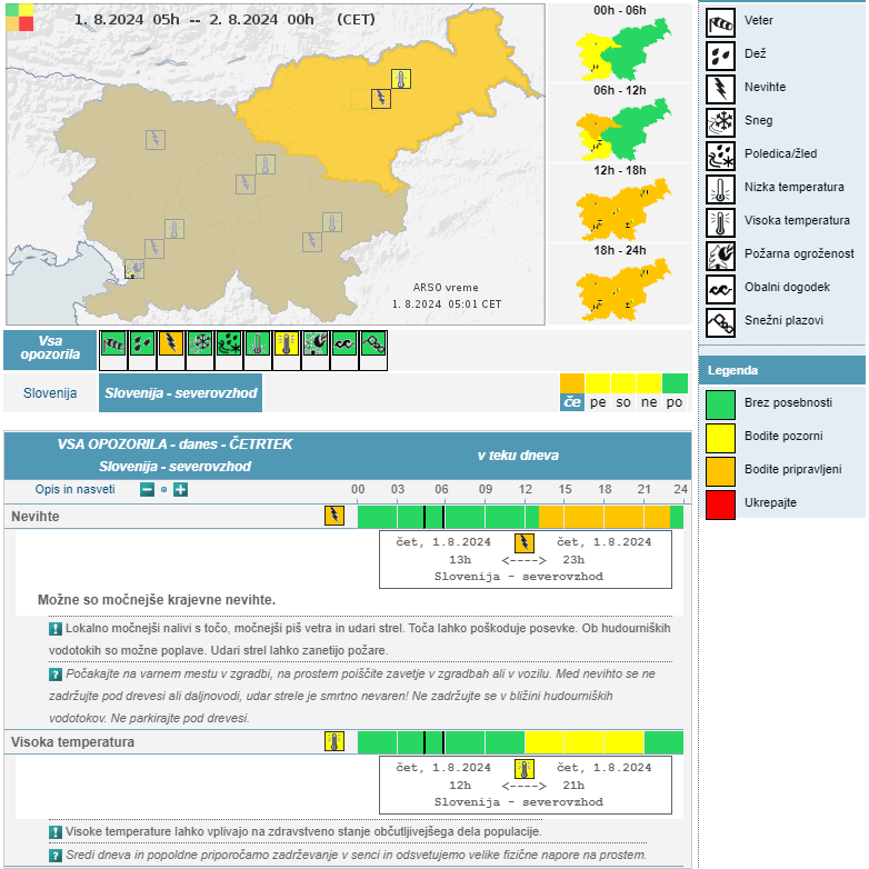 Najbolj burno vremensko dogajanje pričakujejo danes proti večeru in v noči na petek, ko bodo ob prehodu vremenske fronte nastala krajevna neurja. Lokacij močnejših neviht v sredo še niso mogli določiti, tako da je možnosti več in segajo od nastanka posameznih obsežnejših močnejših neviht pa vse do vzpostavitve nevihtne linije, ki bi prešla večji del države.