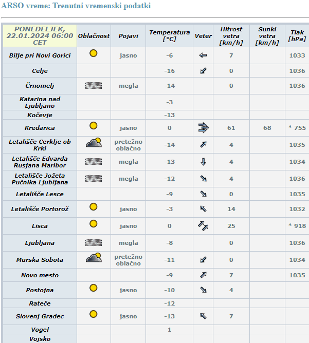 Jutri bo deloma sončno z občasno povečano oblačnostjo. Najvišje dnevne temperature bodo od 3 do 8, na Primorskem okoli 12 °C.