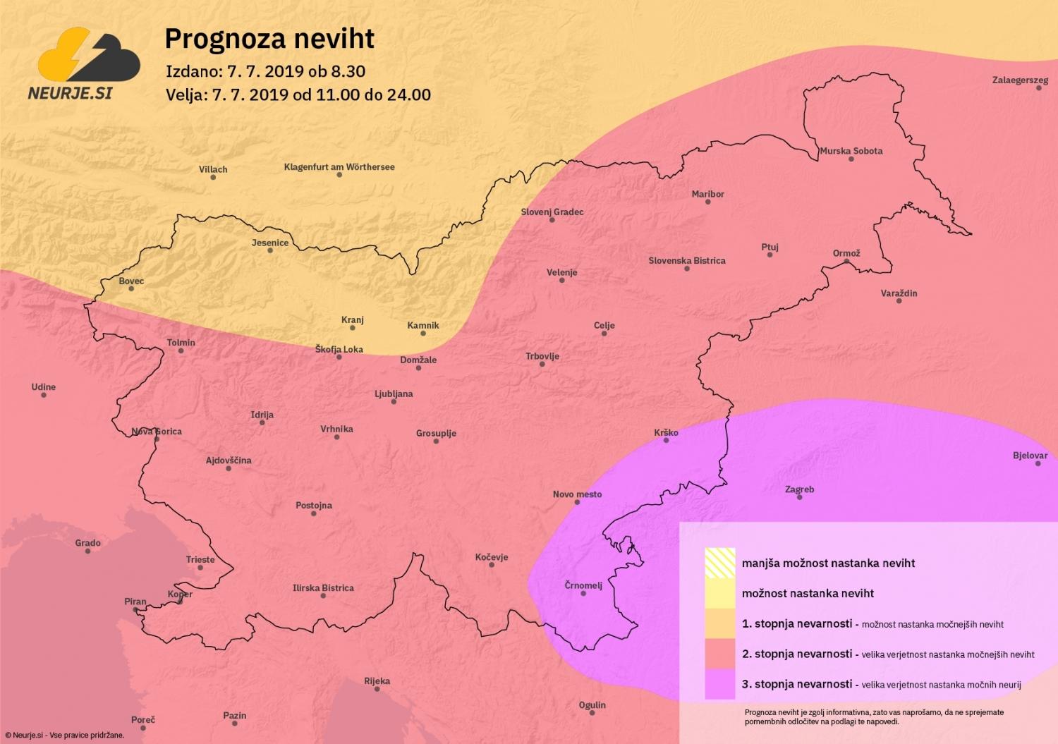 Po zadnjih podtakih spletnega portala neurje.si so v južni polovici Slovenije že nastale prve predfrontalne nevihte. V prihodnjih urah so tam možna neurja s točo, silovitimi nalivi in močnim vetrom. Možen je razvoj superceličnih neviht. Največja nevarnost za neurja bo na Dolenjskem in v Posavju ter nato naprej v smeri Hrvaške (Karlovac, Sisak, Zagreb). Frontalni del poslabšanja pa nas bo od severa zadel v popoldanskem in večernem času.
