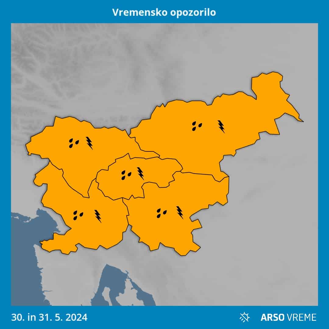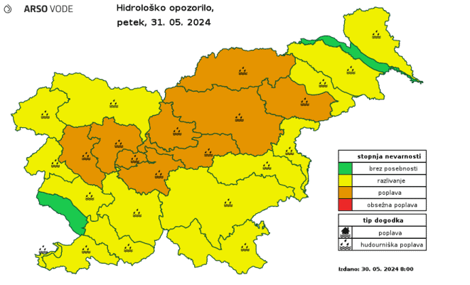 Danes ponoči in v petek bo ob nevihtah z nalivi verjetno hitro naraščanje in razlivanje hudourniških vodotokov in manjših rek ter zastajanje padavinske vode. Posamezni vodotoki lahko tudi poplavijo. Večja verjetnost za ta pojav bo ob vodotokih s povirji na območjih Škofjeloškega in Polhograjskega hribovja, Kamniško-Savinjskih Alp, Zasavja in Pohorja. V severovzhodni Sloveniji je namočenost tal že velika, kar bo pospešilo površinski odtok.