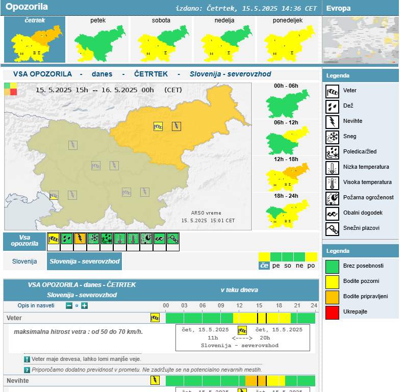 Na severovzhodu Slovenije nastajajo močnejše nevihte, ki jih spremljajo močni nalivi, sunki vetra in možna toča. Radarske slike kažejo na intenzivne nevihte na območju Velenja, Slovenske Bistrice in Ormoža. Tudi tam se pojavljajo nalivi s sunki vetra in točo. Aktivnost neviht bo vztrajala še v večernih urah, nato se bo pomaknila proti jugu in osrednji Sloveniji.
