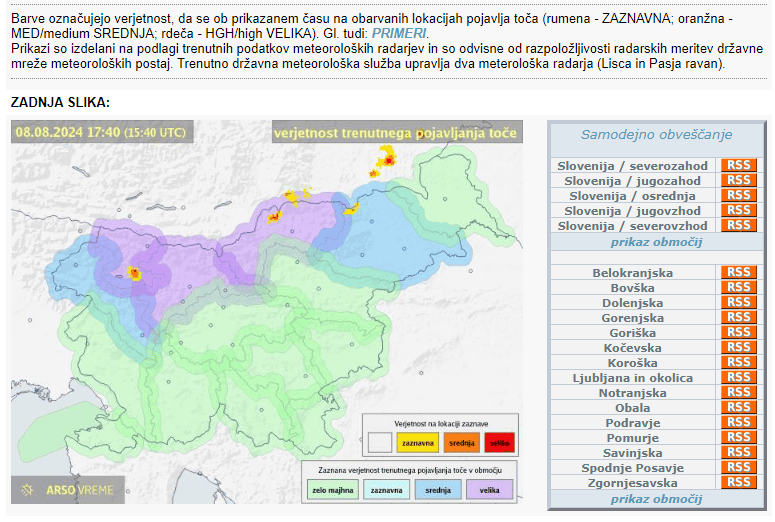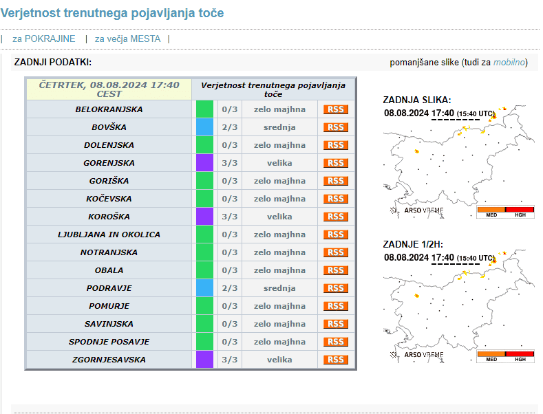 Na njihovi spletni strani so objavili zadnje podatke glede verjetnostni trenutnega pojavljanja toče. Za Koroško je tako izdan vijoličen alarm.