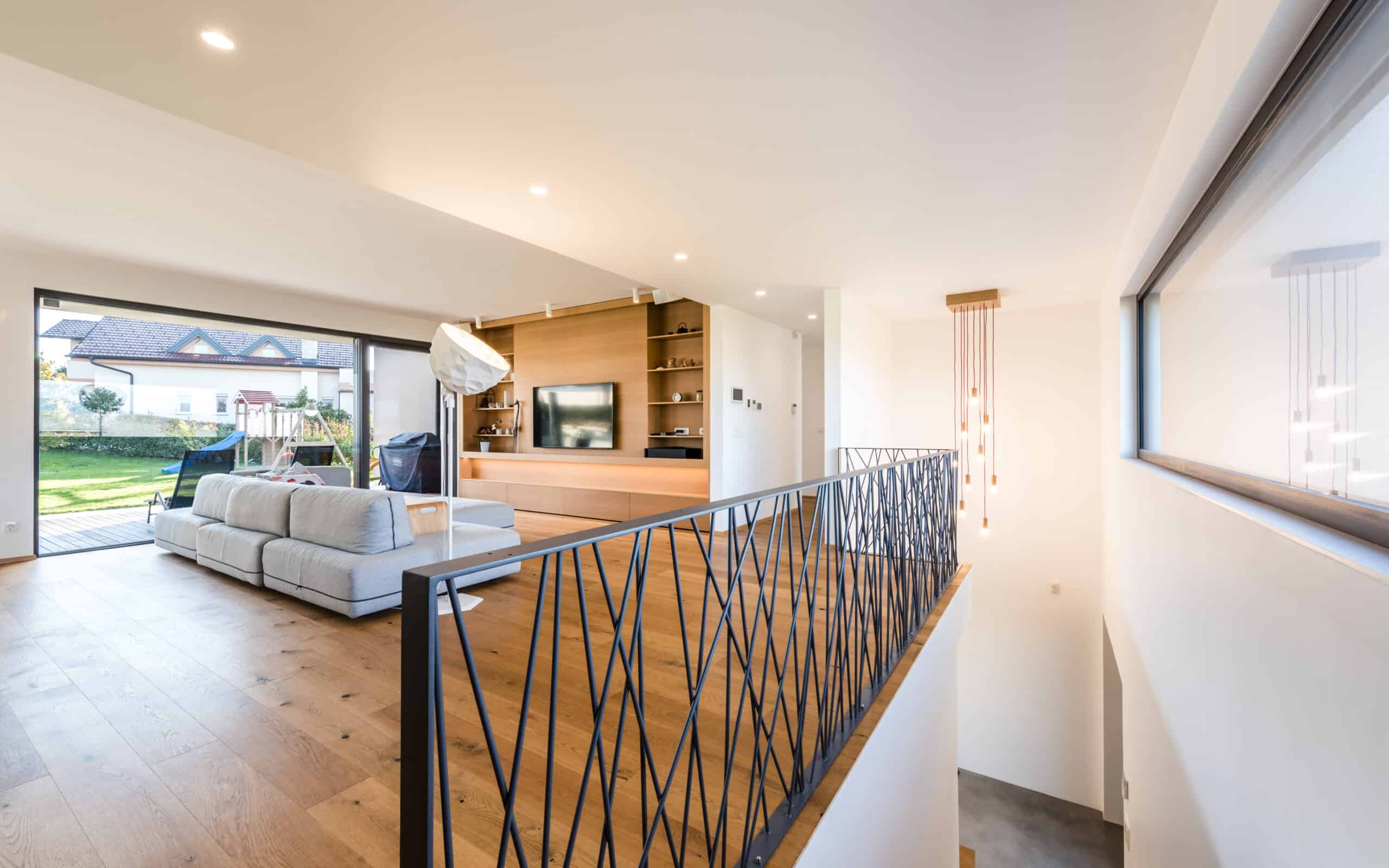 Ko torej družina prispe domov, v hišo vstopi še na ravni ceste; a odprto stopnišče z umetelno oblikovano železno ograjo obiskovalca takoj popelje v zgornjo etažo, položeno na družinski vrt. Dnevno-bivalni prostor je zasnovan odprto – ne le, da se v njem prepletajo kuhinjski, jedilni in počivalni kotiček, pač pa se preko drsnih panoramskih sten odpre navzven, na bivalno teraso in na zelenico.