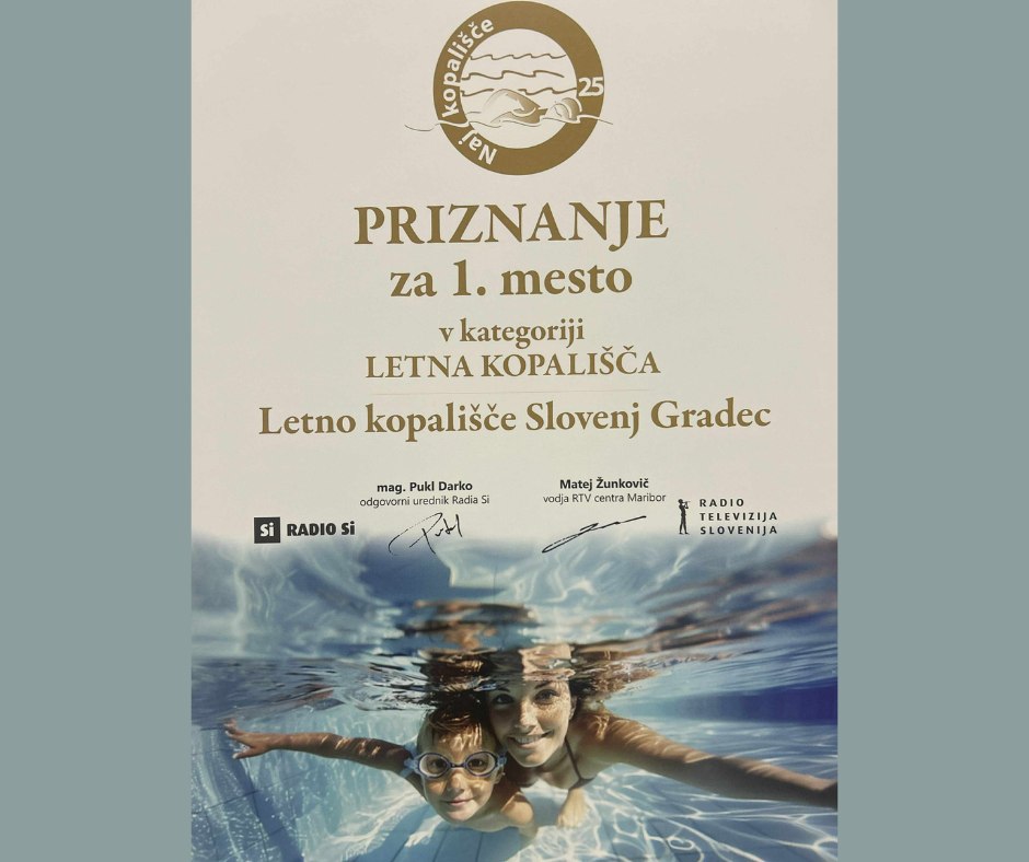 Danes so se predstavniki Javnega zavoda Spotur in Aqualatia Slovenj Gradec z velikim ponosom udeležili podelitve priznanj Naj kopališče 2025, kjer je med kar 50 sodelujočimi kopališči Aqualatio prejel 1. mesto v kategoriji "Letna kopališča".
