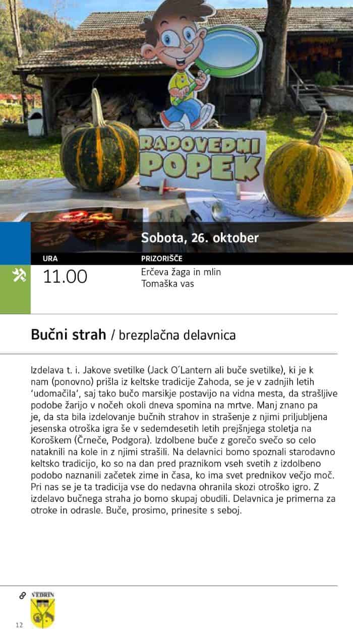 Kakšno veselje otrokom prinašajo izrezljane buče, ki so tekom časa postale pravi simbol noči čarovnic, ki ga sicer praznujemo zadnji dan v oktobru. T.i. Jakove svetilke so dekoracija, ki je dostopna večini ljudi, vzame pa le malo časa in delo. A če vam je zmanjkalo idej, kakšen motiv bo letos imela vaša buča, vas v soboto, 26.10.2024 ob 11. uri vabijo na Herčevo Žago in mlin v Tomaško vas na brezplačno delavnico z imenom "Bučni strah". Vse, kar potrebujete, je le buča in dobra volja. Za ostalo bodo poskrbeli oni.