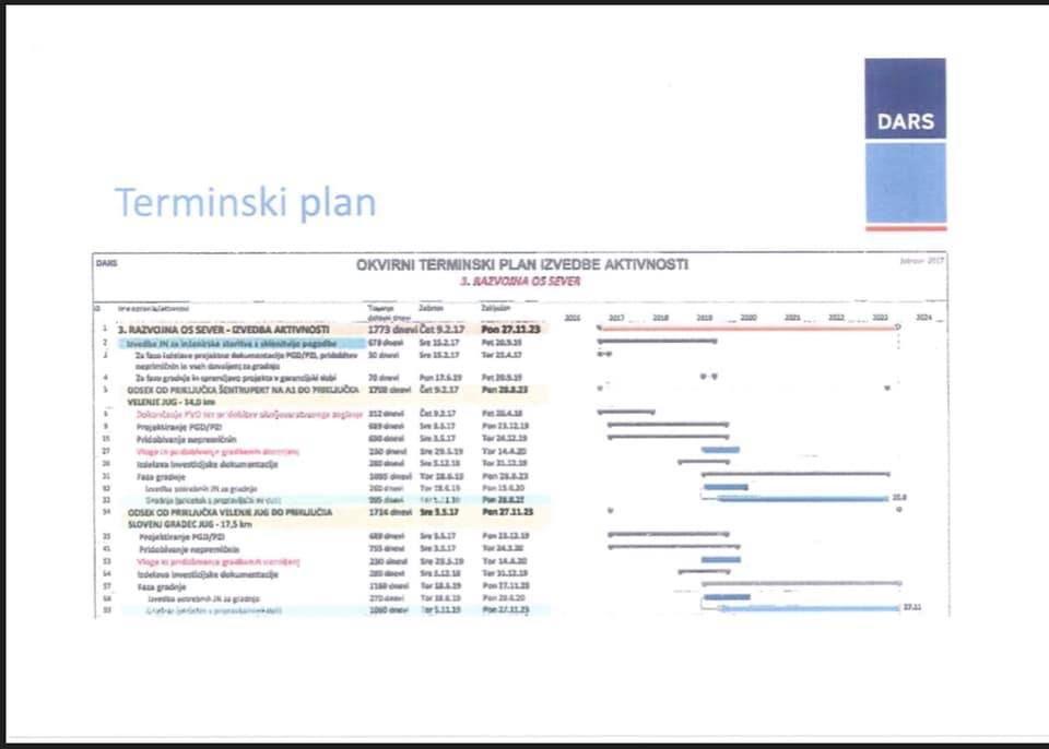 "Zato objavljamo prilogo Protokola o poteku načrtovanja in izgradnje 3. razvojne osi na odseku Šentrupert – Velenje – Slovenj Gradec – Dravograd – Holmec, na kateri je razvidno, da je DARS pripravil terminski plan oz. časovnico izgradnje 3. razvojne osi na Koroško. Ta tabela je za čas izgradnje odseka Šentrupert – Velenje – Slovenj Gradec predvidela leto 2023. Na tabeli je viden tudi logotip DARS, kar je evidentni dokaz, da je Družba za avtoceste sodelovala pri pripravi protokola oz. pripravila časovnico izgradnje 3. razvojne osi na Koroško.