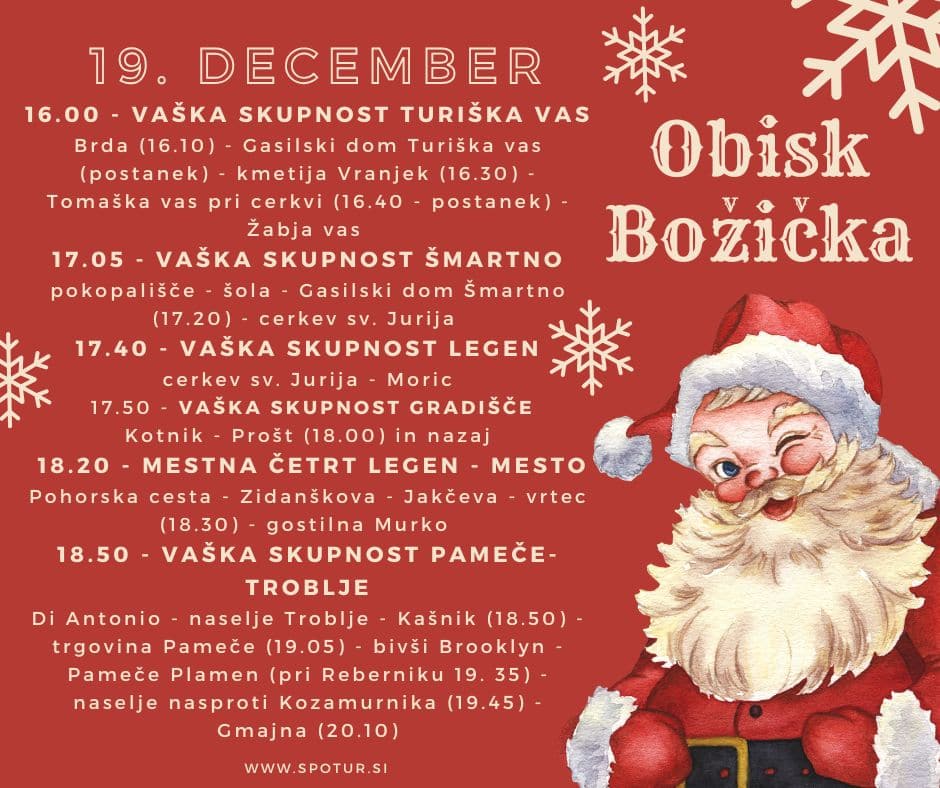 Božiček se bo v Slovenj Gradcu in okolici mudil kar tri dni. Med 17. in 19. decembrom bo Božiček s svojim posebnim prazničnim vozilom prevozil celo občino, obiskal bo vse mestne četrti in vaške skupnosti ter pozdravil in obdaril otroke.
