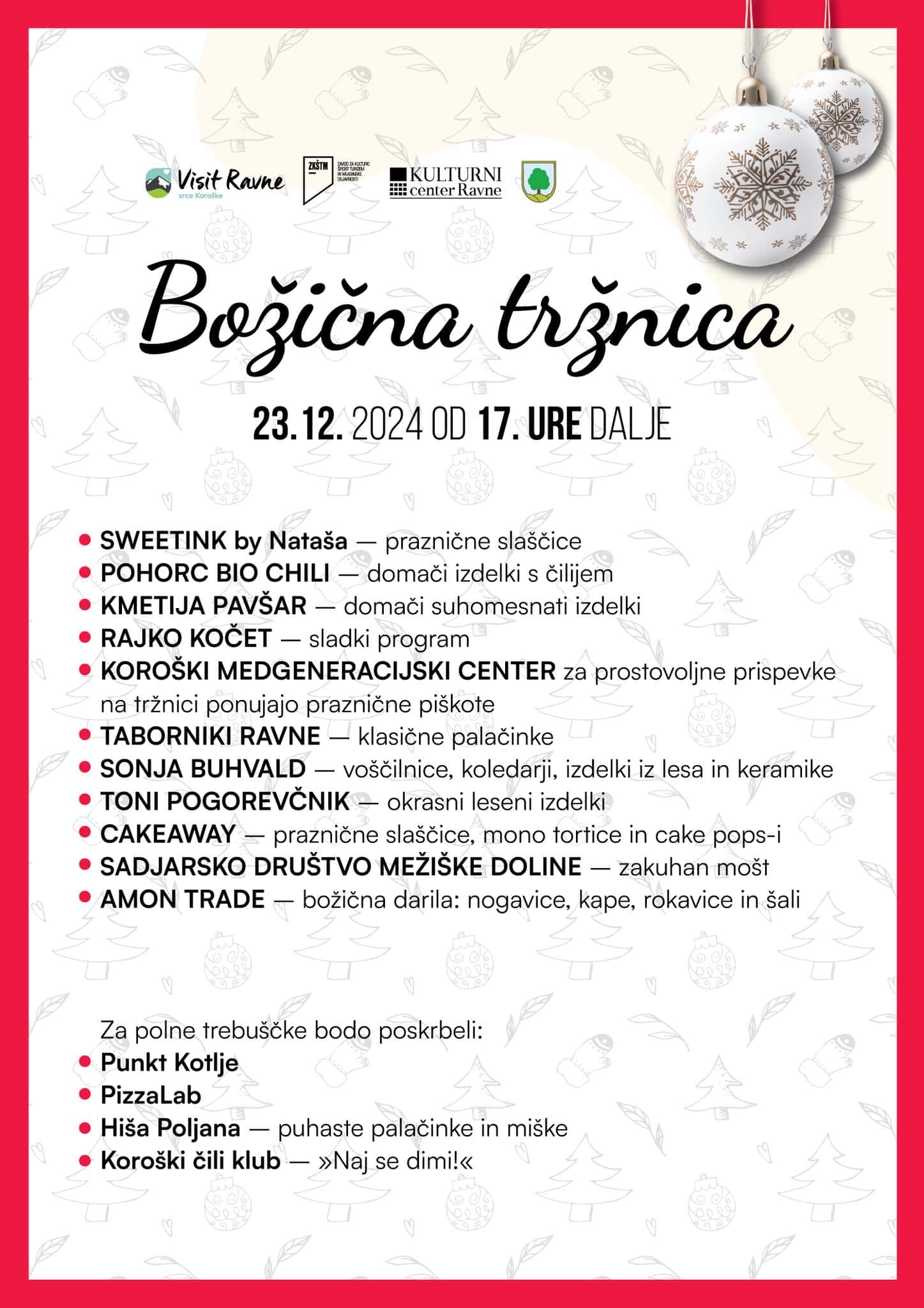 Na tržnici, ki jo boste lahko obiskali od 17. ure naprej, boste zagotovo našli nekaj zase, saj bo ponudba zares pestra. Mogoče najdete točno to, kar vam še manjka med darili, ki jih boste postavili pod drevešček.