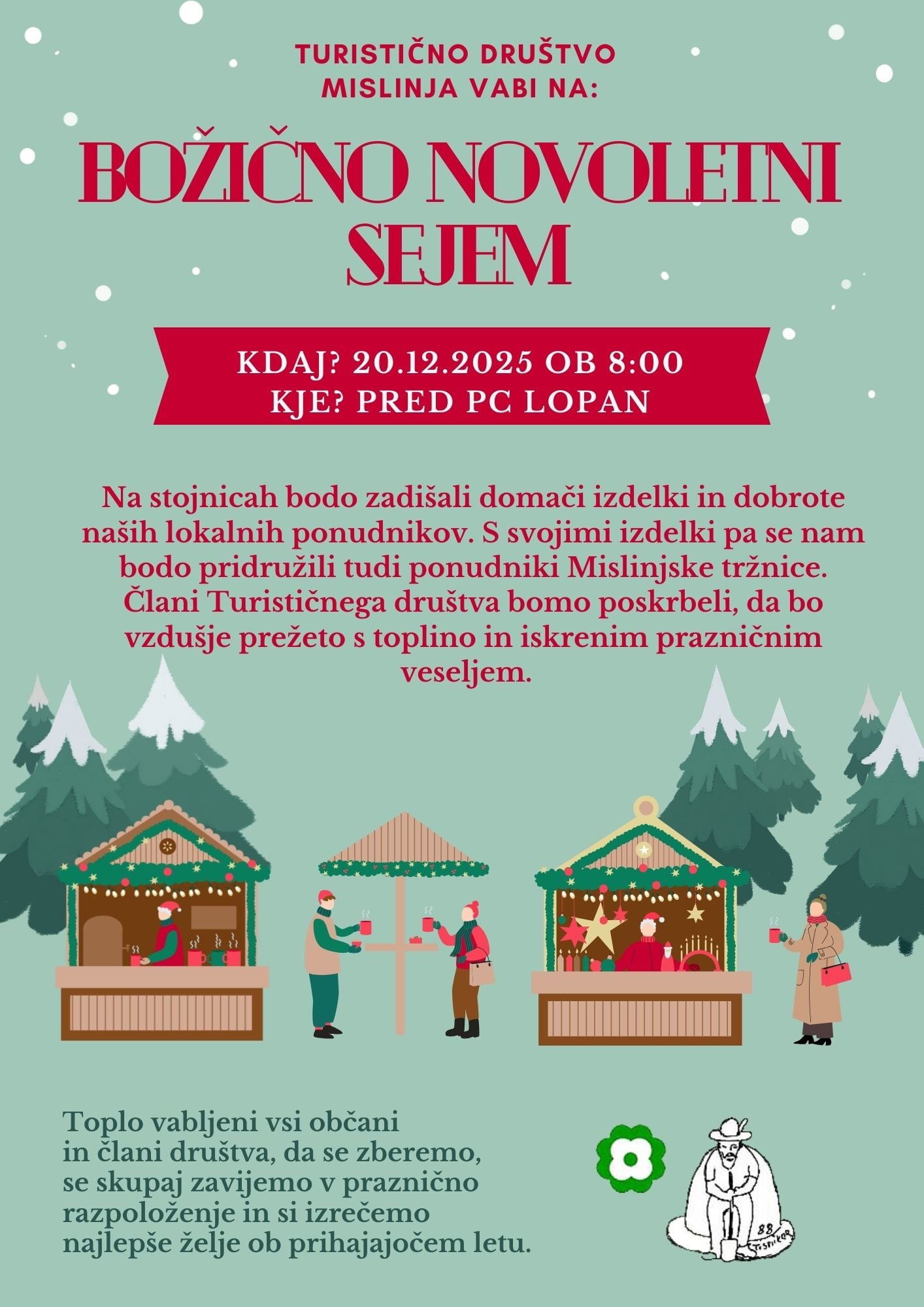 Turistično društvo Mislinja zato vabi na božično-novoletni sejem, na katerem boste našli še tiste drobne pozornosti, zaradi katerih bodo prazniki še lepši. V soboto, 20. decembra 2025, od 8. ure, se bodo pred PC Lopan predstavili številni lokalni ponudniki, pridružili pa se jim bodo tudi ponudniki z Mislinjske tržnice. S stojnic bodo zadišali domači izdelki in lokalne dobrote, člani TD Mislinja pa bodo poskrbeli, da bo vzdušje prežeto s toplino in iskrenim prazničnim veseljem.