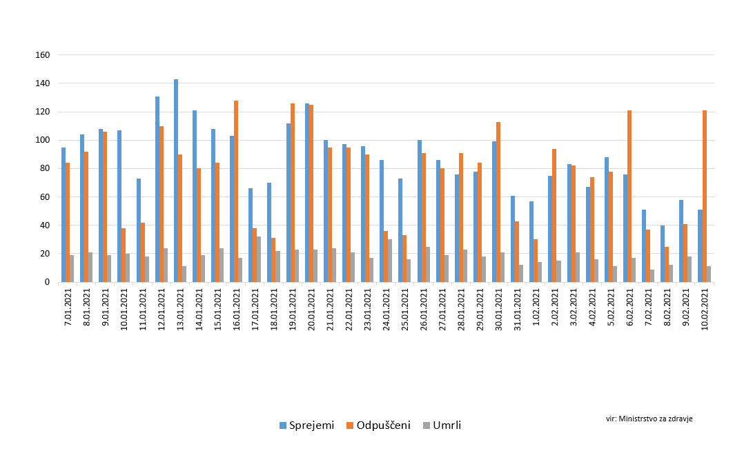 Skupaj je bilo včeraj v bolnišnice sprejetih 51 pacientov, kar 121 pa jih je bilo iz bolnišnic odpuščenih. Med 864, ki so se zdravili v bolnišnici, jih je v torek intenzivno nego potrebovalo 160, kar je dva manj kot dan prej.