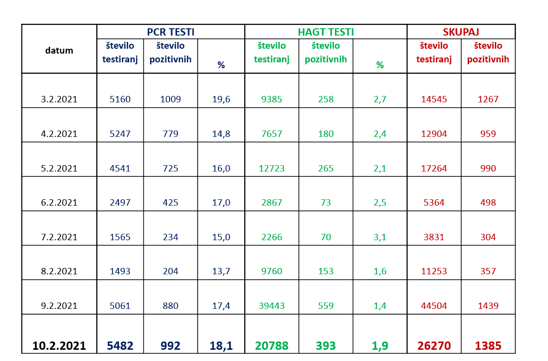 Včeraj je bilo opravljenih 5.482 PCR testiranj. Potrjenih je bilo 992 novih okužb, kar pomeni, da je delež pozitivnih PCR testov znašal 18,1 %. Opravljenih je bilo tudi 20.788 hitrih antigenskih testov. Z njimi je bilo potrjenih 393 novih okužb, je pojasnila Bratuša.