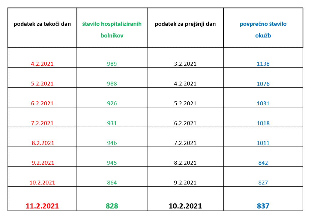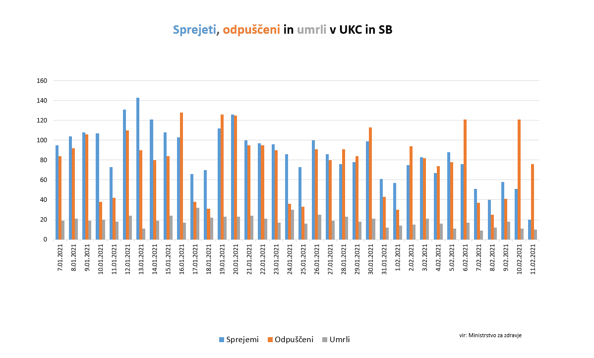 Bolnišnično oskrbo danes potrebuje 828 covidnih pacientov, 36 manj kot včeraj. Na intenzivni negi se zdravi 157 pacientov oziroma 3 manj kot smo poročali včeraj. Skupaj je bilo sicer včeraj v bolnišnice sprejetih le 20 pacientov, tako nizkega števila sprejemov nismo zabeležili že resnično dolgo, 76 pa jih je bilo iz bolnišnic odpuščenih, je povzela Bratuša.