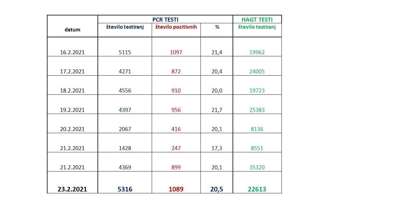 Vladna govorka Maja Bratuša je pojasnila, da je bilo včeraj opravljenih 5.316 PCR testiranj in 22.613 hitrih antigenskih testov. S PCR testiranji je bilo potrjenih 1.089 novih okužb.