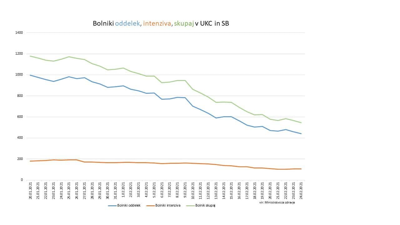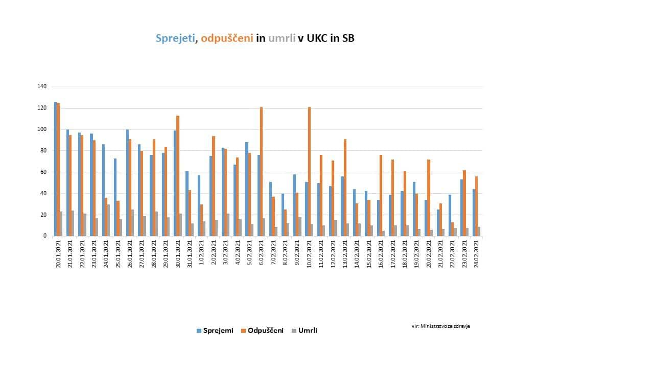 Število hospitaliziranih se še naprej znižuje. Danes je tako v naših bolnišnicah hospitaliziranih 21 covidnih pacientov manj kot včeraj, skupaj 546. Na intenzivni negi se zdravi 105 pacientov, 2 manj kot včeraj. Skupaj je bilo včeraj v bolnišnice sprejetih 44 pacientov. Iz bolnišnic pa je bilo včeraj skupaj odpuščenih 56 pacientov. V UKC Ljubljana se zdravi 188 pacientov s potrjeno okužbo, od tega 27 na intenzivni terapiji. Umrlo je še 10 oseb, je pojasnila Bratuša.